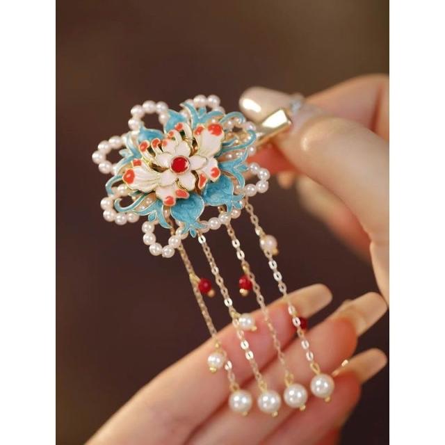 髮夾蓬鬆古風漢服旗袍新中式配飾燒藍貝珠花朵丸子頭邊夾流蘇髮飾