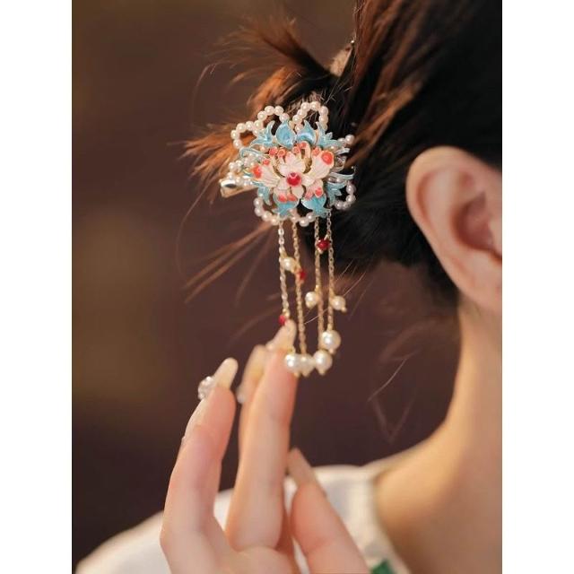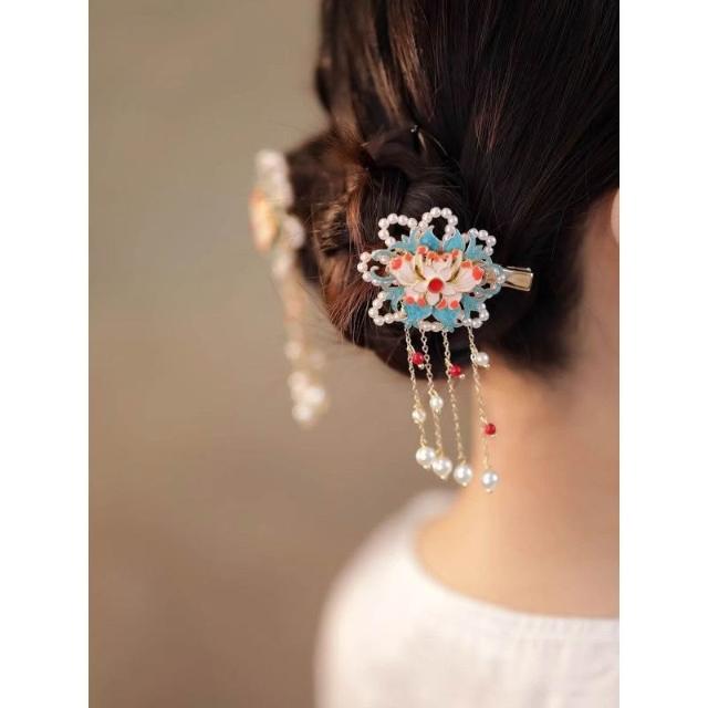 髮夾蓬鬆古風漢服旗袍新中式配飾燒藍貝珠花朵丸子頭邊夾流蘇髮飾