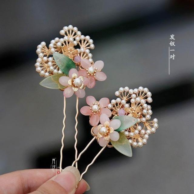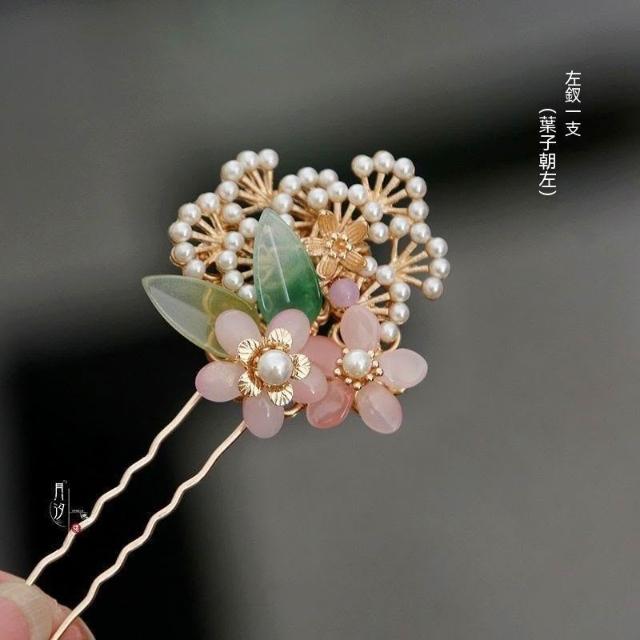 半夏 原創設計古風漢服髮釵琉璃花朵合金松枝髮簪子古典頭飾