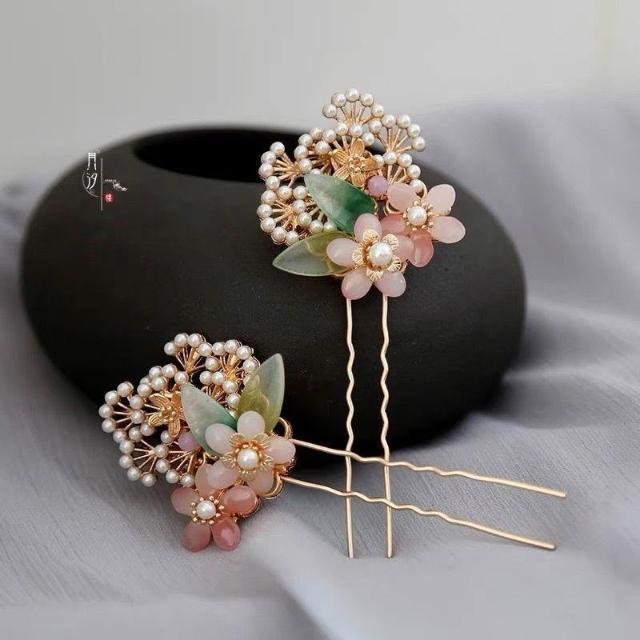 半夏 原創設計古風漢服髮釵琉璃花朵合金松枝髮簪子古典頭飾