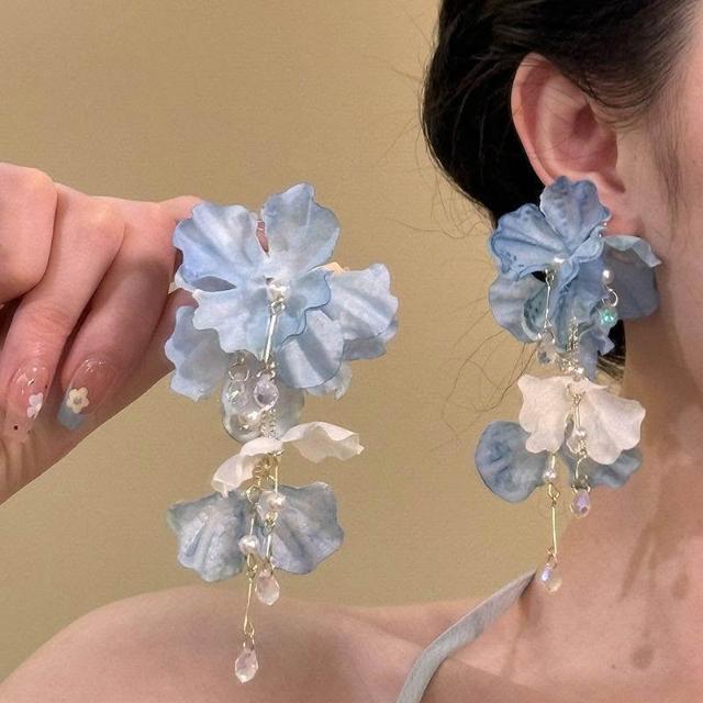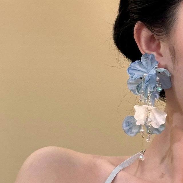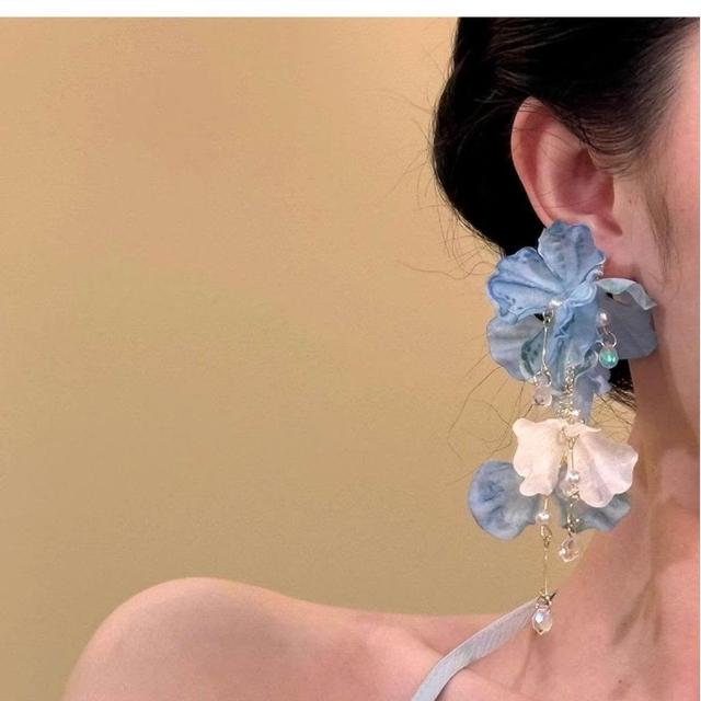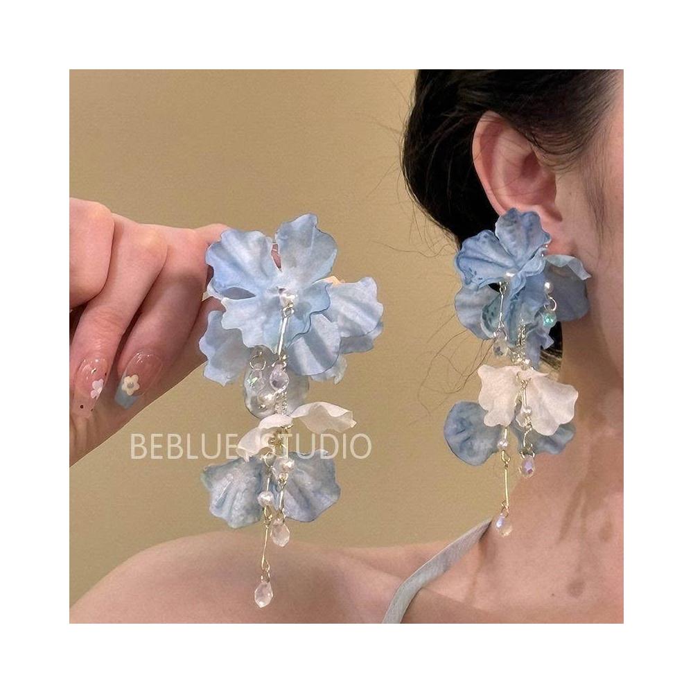 玫瑰冰茶~藍色流蘇花朵耳釘女高級感度假風小衆耳環絕美耳飾耳夾