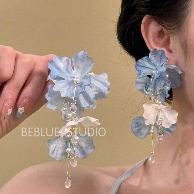 玫瑰冰茶~藍色流蘇花朵耳釘女高級感度假風小衆耳環絕美耳飾耳夾