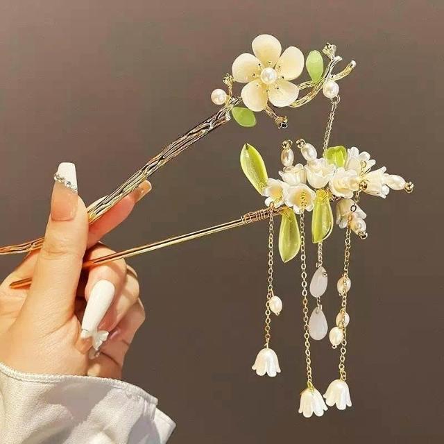 玉蘭花髮簪古風簪子漢服頭飾女旗袍髮飾流蘇珍珠金屬髮釵步搖1#