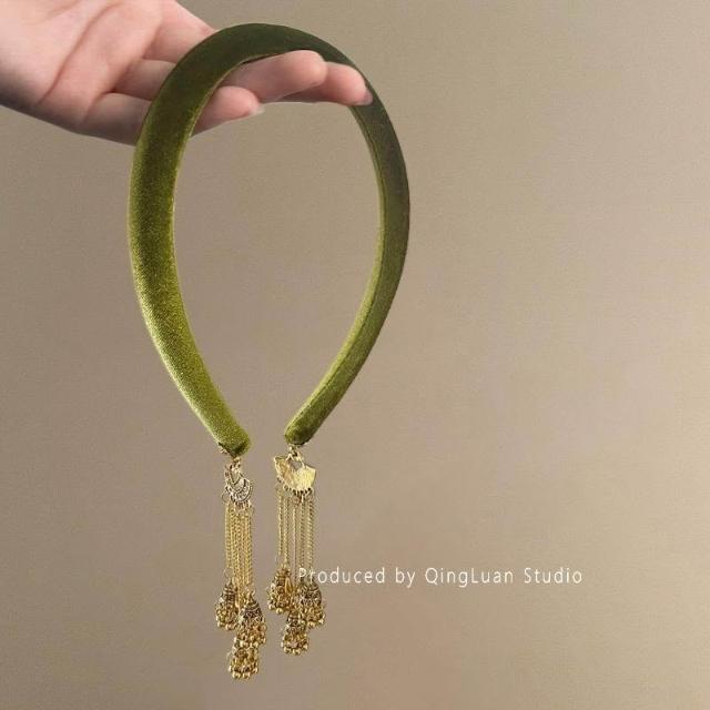 秋冬復古綠新中式流蘇絲絨髮箍假耳環高級感頭箍古風發飾頭飾髮卡