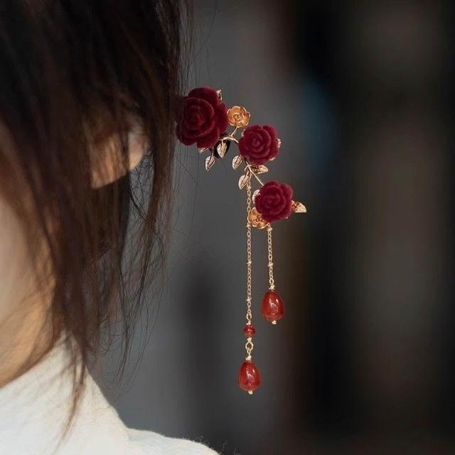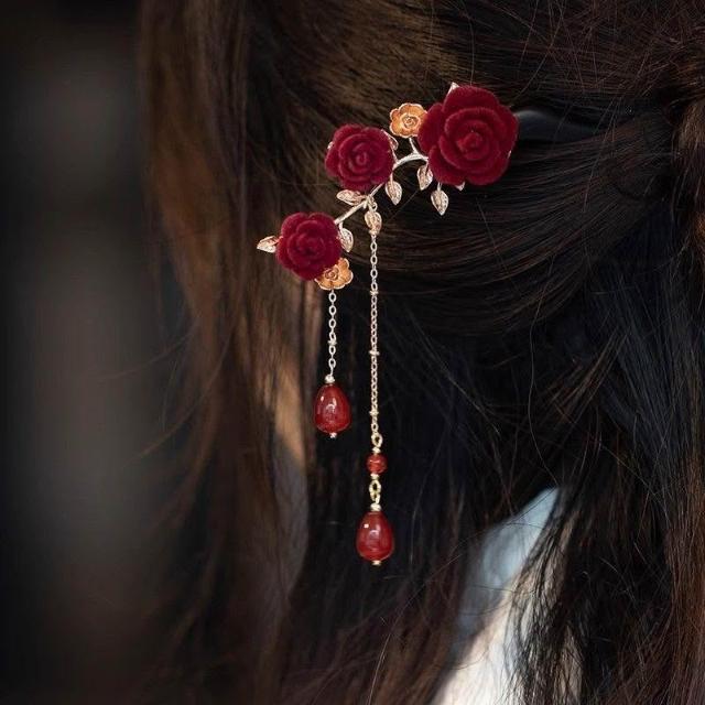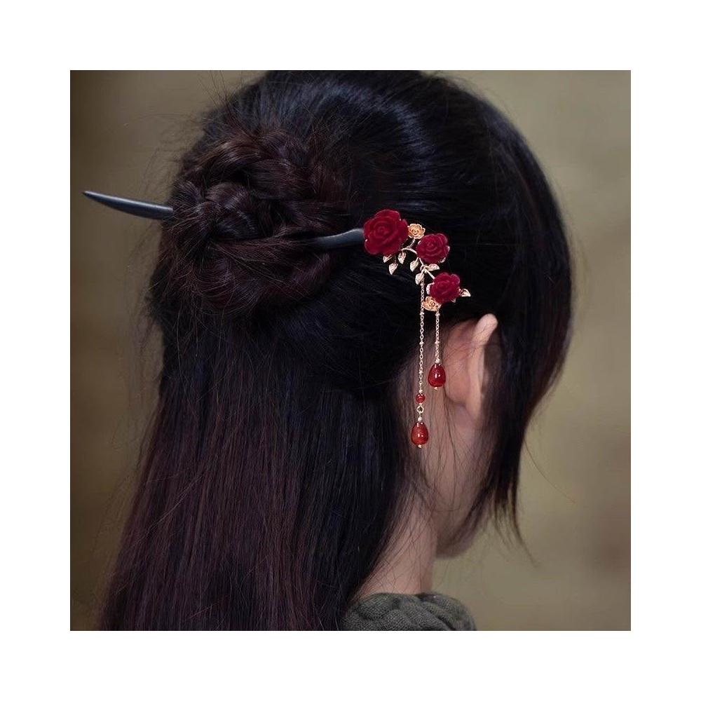 精緻玫瑰花檀木盤髮簪子古風漢服旗袍日常丸子頭新中式髮飾超仙