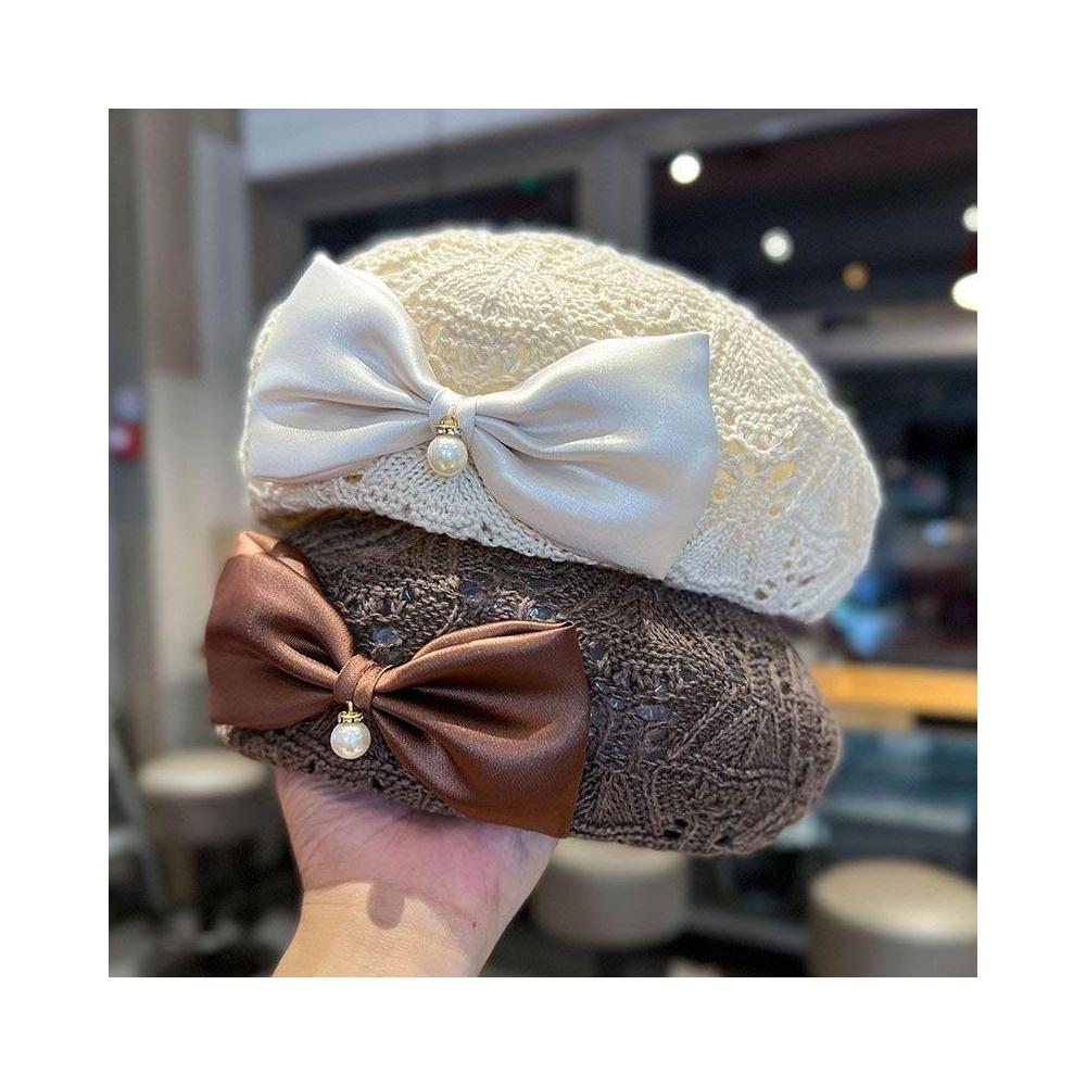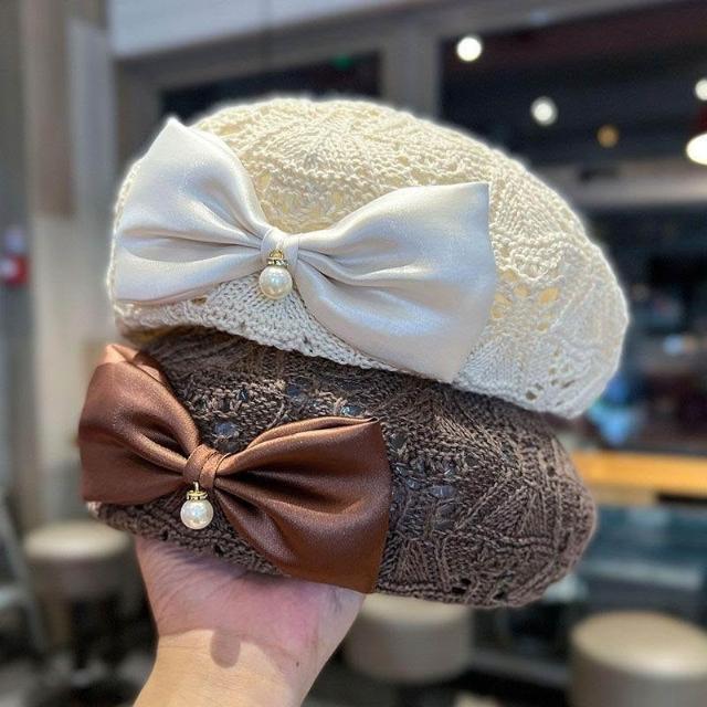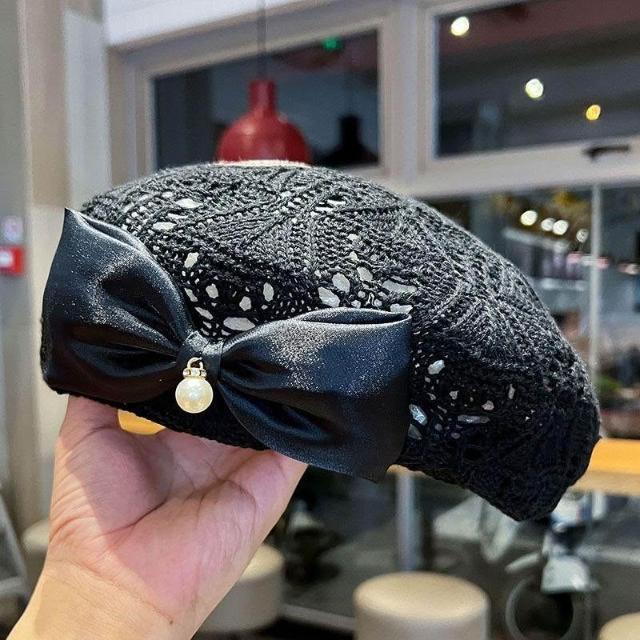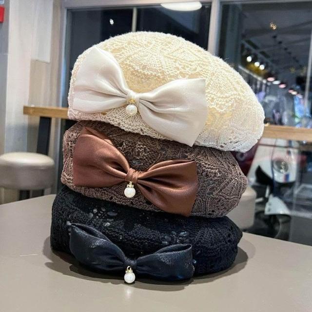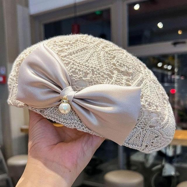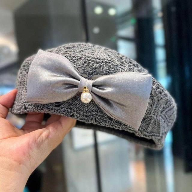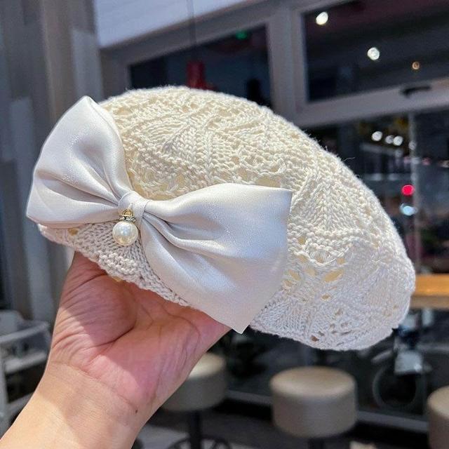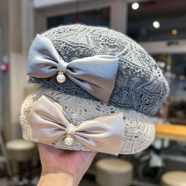 新款蝴蝶結貝雷帽子女春秋夏季時尚編織鏤空透氣百搭顯臉小畫家帽
