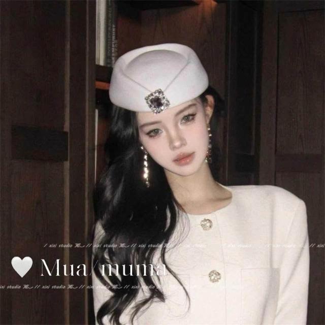 高級感方鑽黑色白色小禮帽千金風圓頂貝雷帽穿搭配飾帽子配禮服女