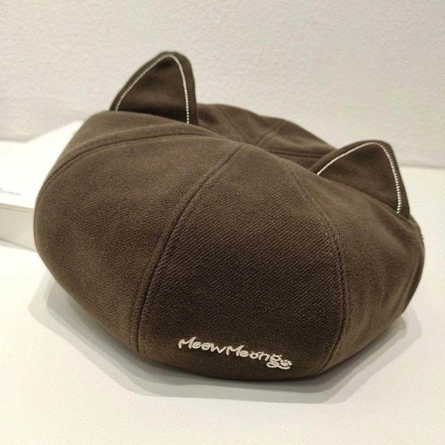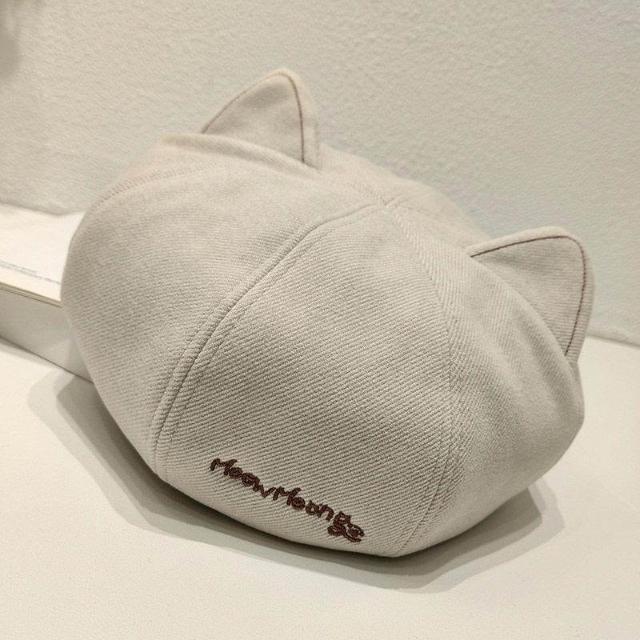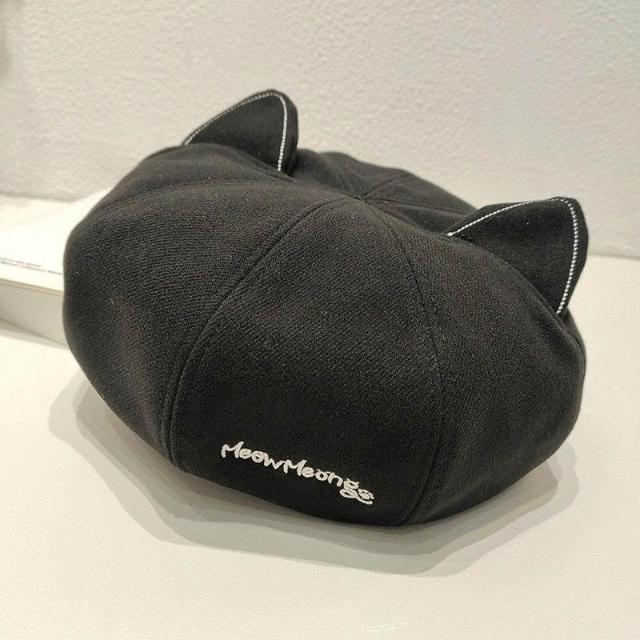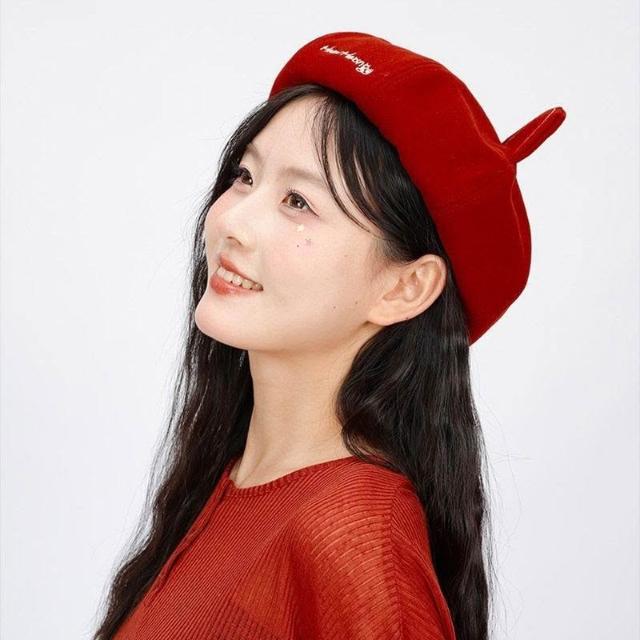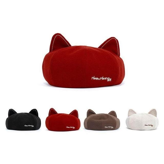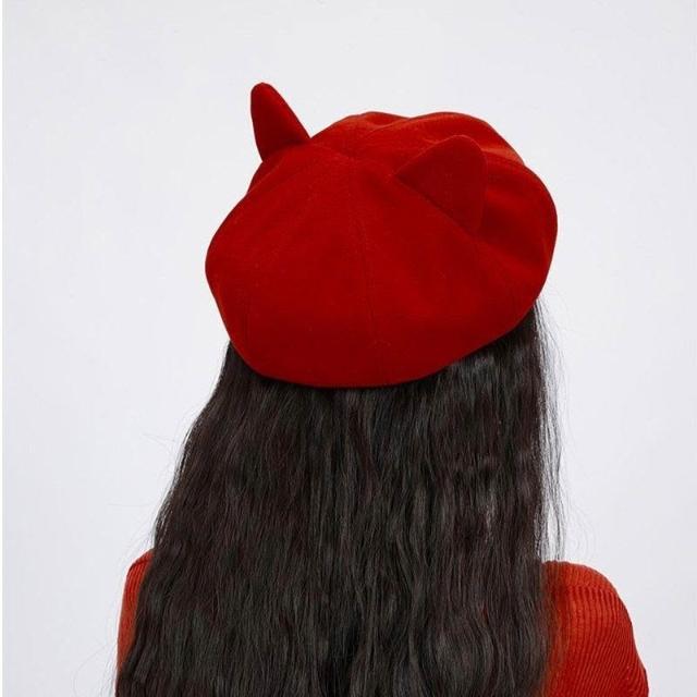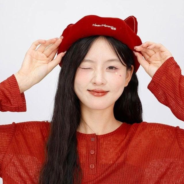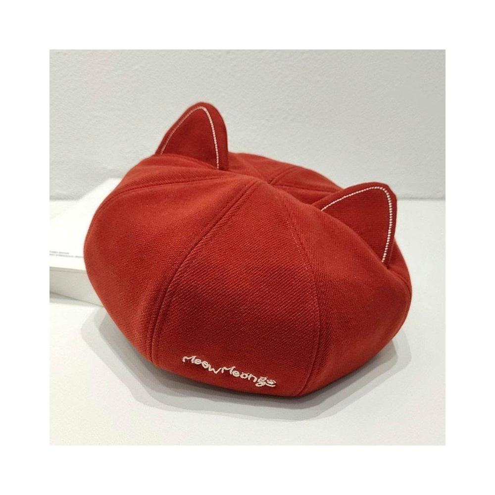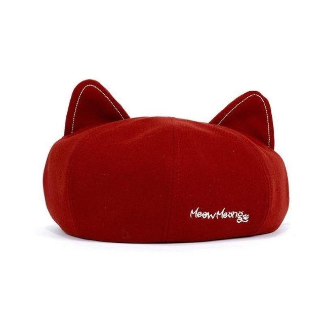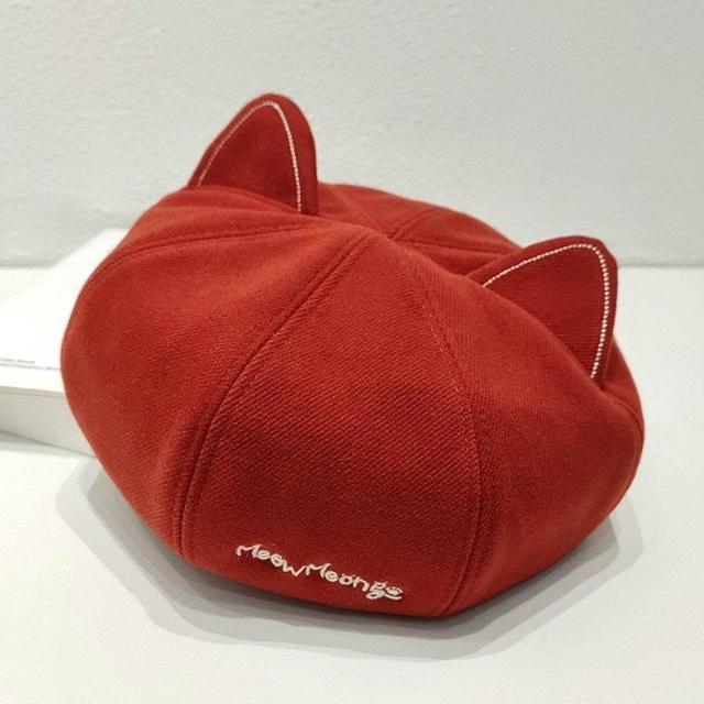 可愛學院風貓耳朵帽子貝雷帽女秋冬日系毛呢百搭紅色大頭圍畫家帽