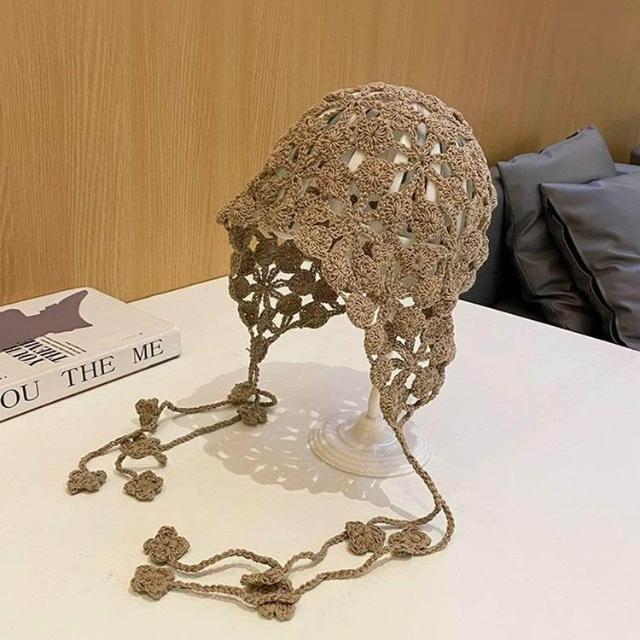 森系手工鉤花流蘇帽子夏透氣鏤空棉線少女包頭帽波西米亞風套頭帽