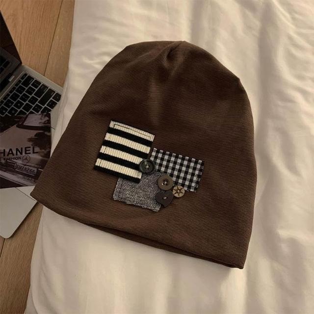 日系黑色堆堆帽女春秋款冷帽網紅條紋貼布設計感顯臉小大頭圍帽子