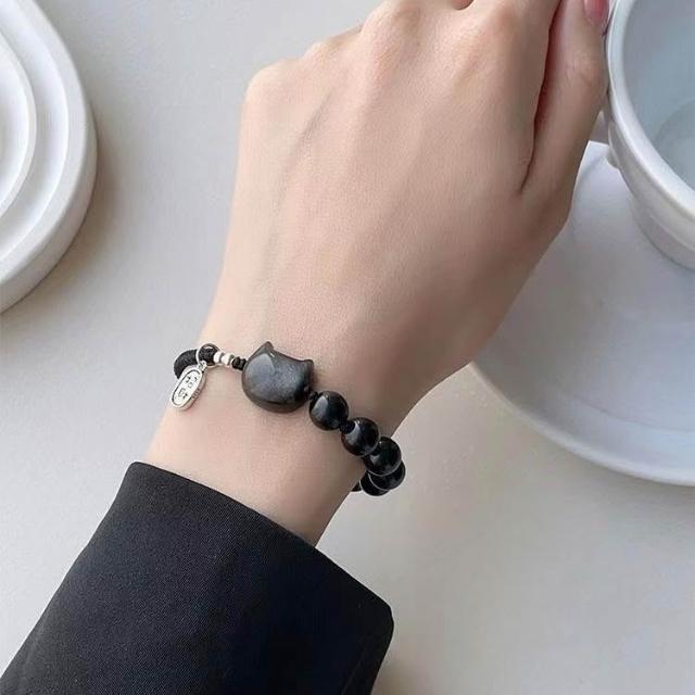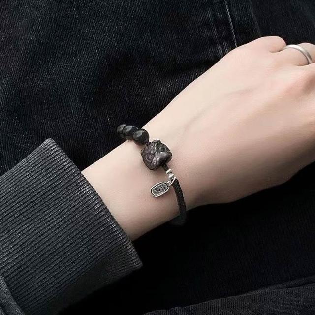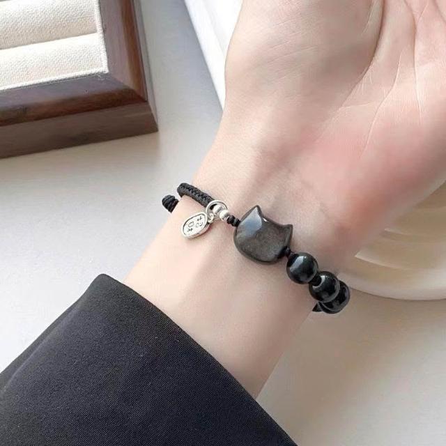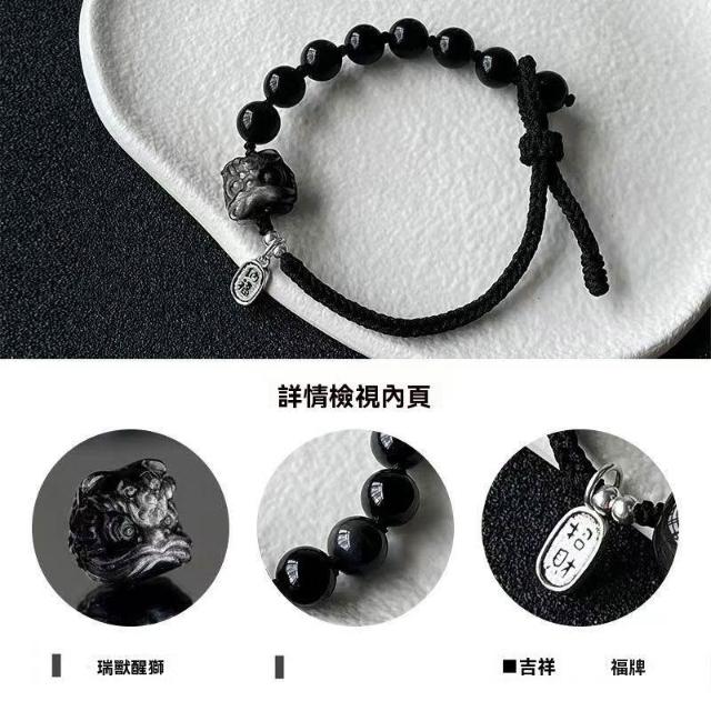 黑曜石手鍊ins小衆設計醒獅編織繩簡約閨蜜手繩輕奢轉運情侶禮物