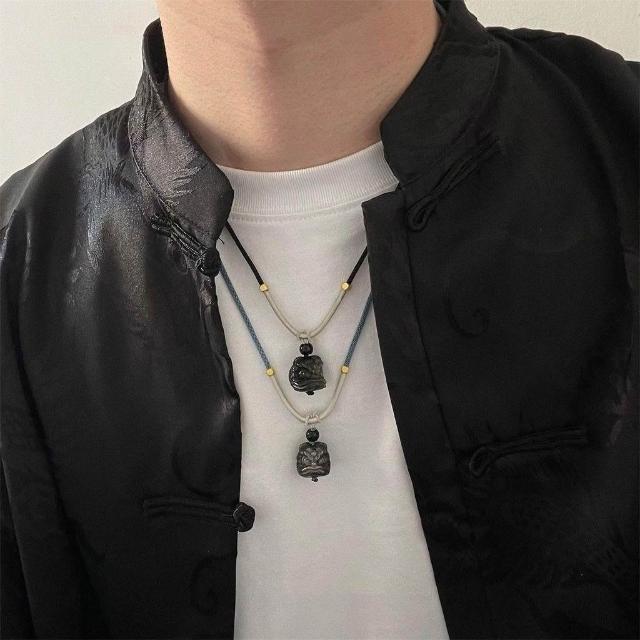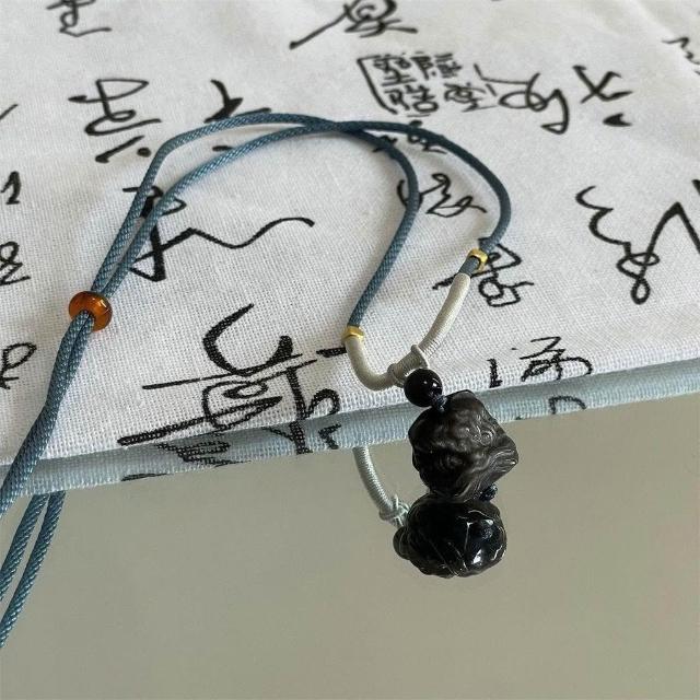 天然銀曜石醒獅吊墜黑曜石掛墜水晶情侶項鍊玉石新中式男女調節繩