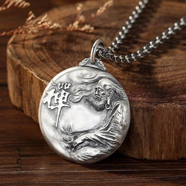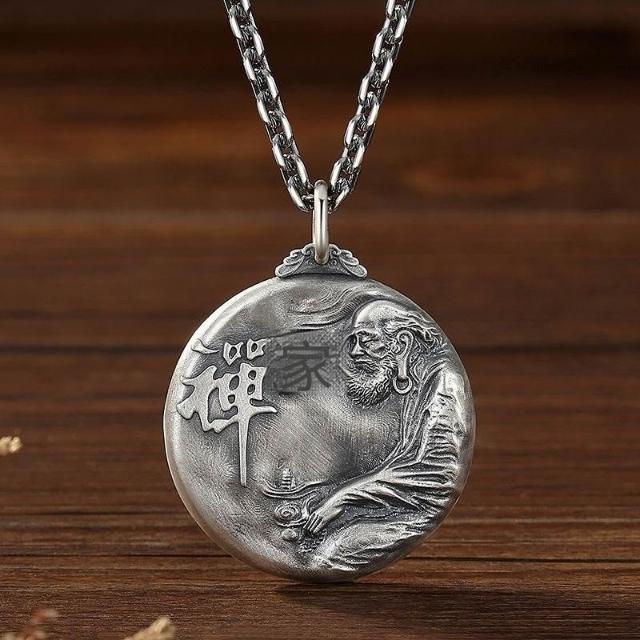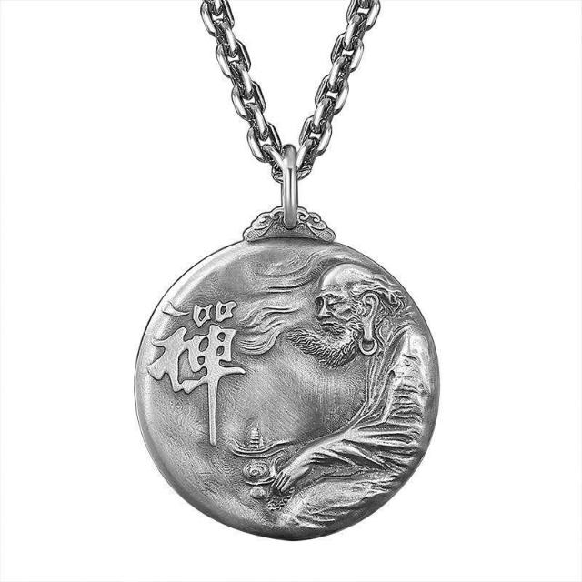 禪悟達摩祖師吊墜黃銅鍍銀男士復古實心大號圓形佛牌個性銀項鍊款