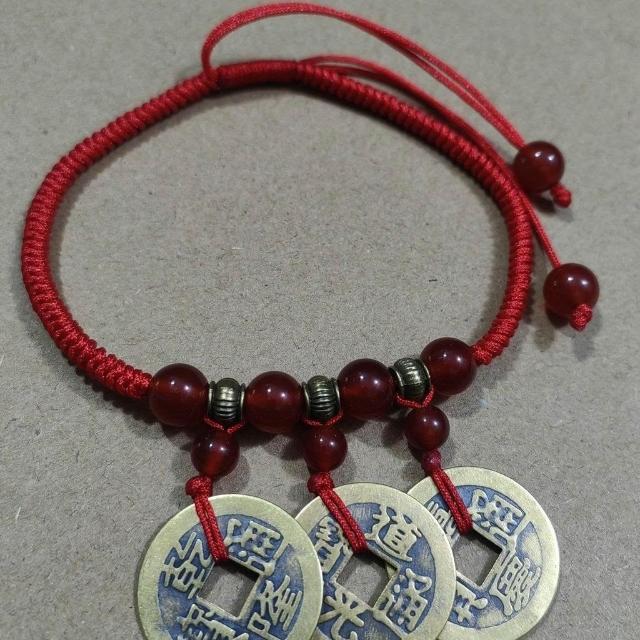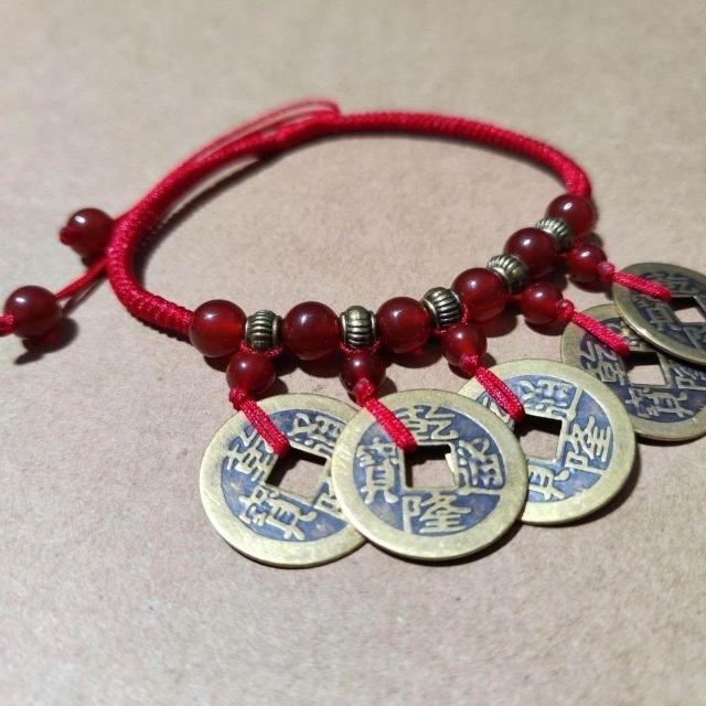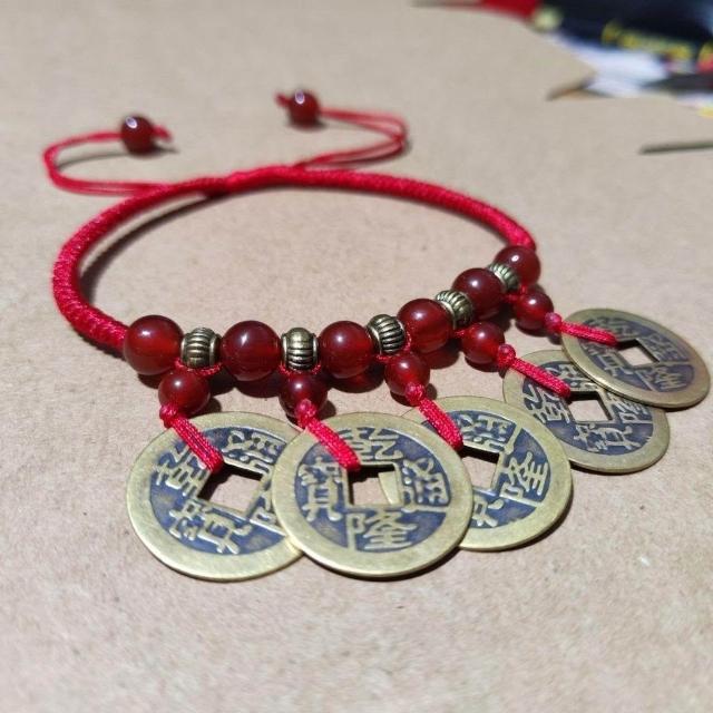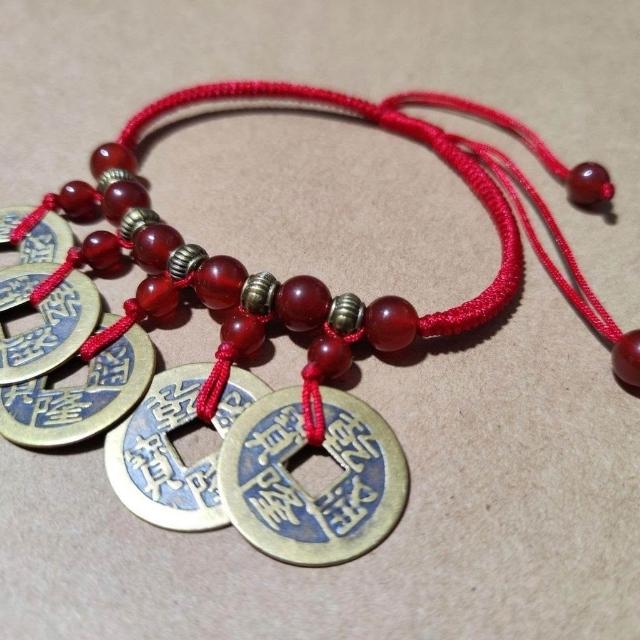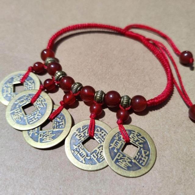 原創民族風銅錢腳鏈本命年純銅轉運紅繩男女瑪瑙手工手鍊編織五帝