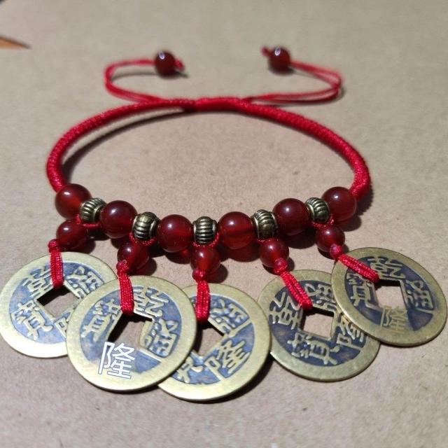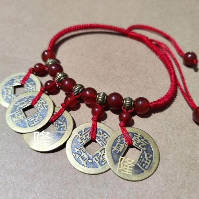 原創民族風銅錢腳鏈本命年純銅轉運紅繩男女瑪瑙手工手鍊編織五帝