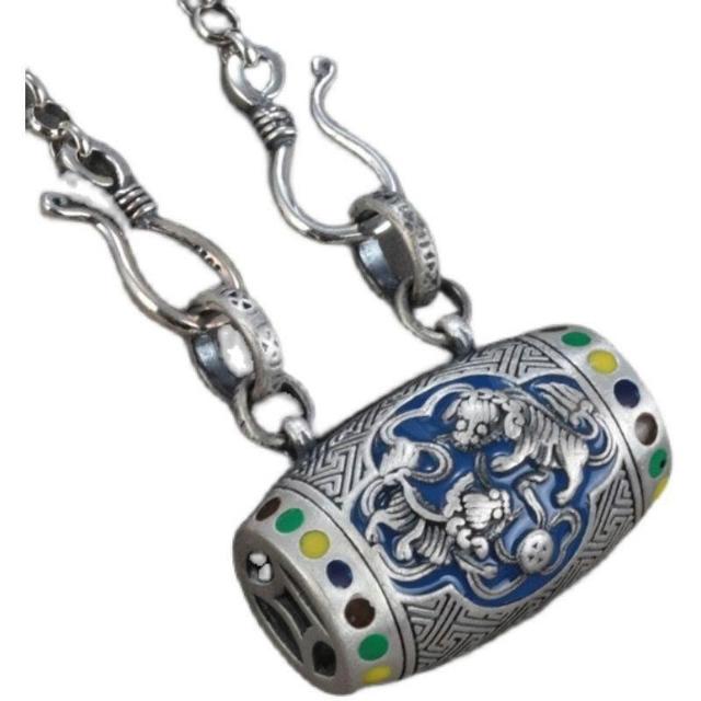 雙環舞獅燒藍鼓吊墜男女復古鍍古銀項鍊掛墜民族風五彩獅子鼓掛件