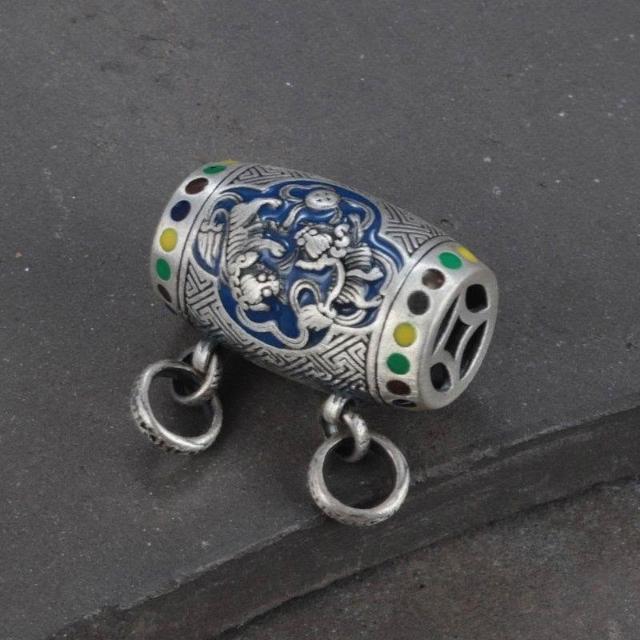 雙環舞獅燒藍鼓吊墜男女復古鍍古銀項鍊掛墜民族風五彩獅子鼓掛件