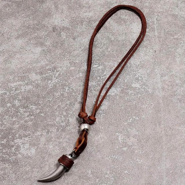 民族風復古銀色牛角狼牙長款項鍊牛皮繩男個性潮流霸氣飾品送男友
