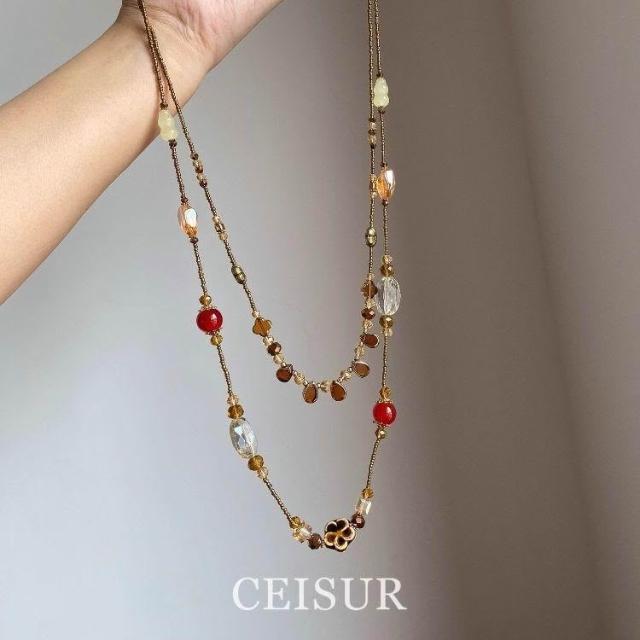 中古vintage雙層陶瓷水滴葫蘆花朵項鍊復古個性小衆高級感鎖骨鏈