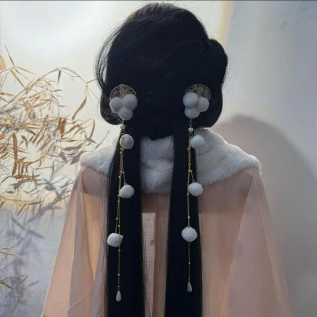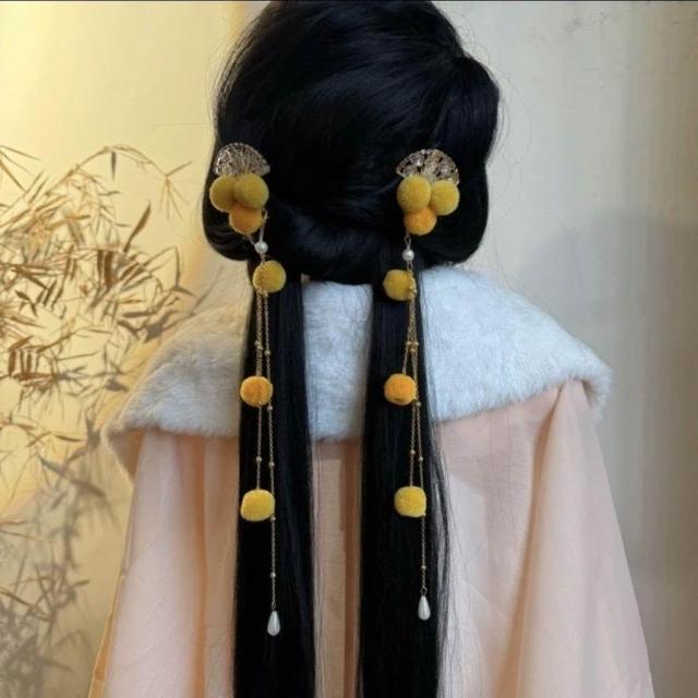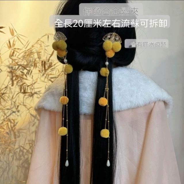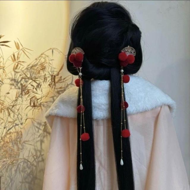 毛球髮飾紅色髮簪百搭古風簪子新年漢服髮飾毛球夾子中國風長款