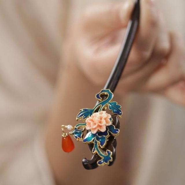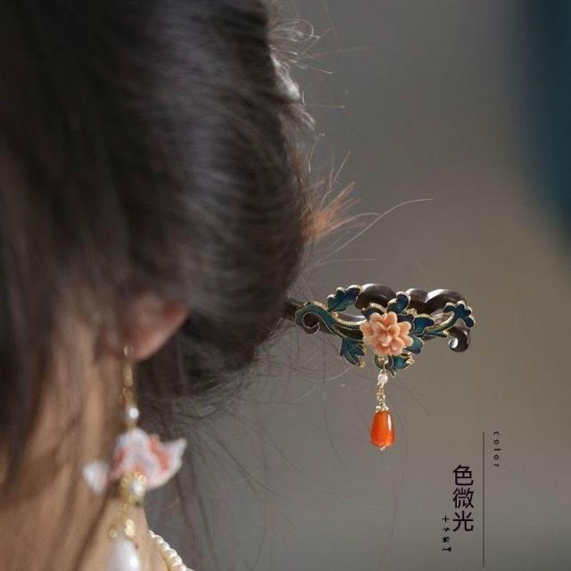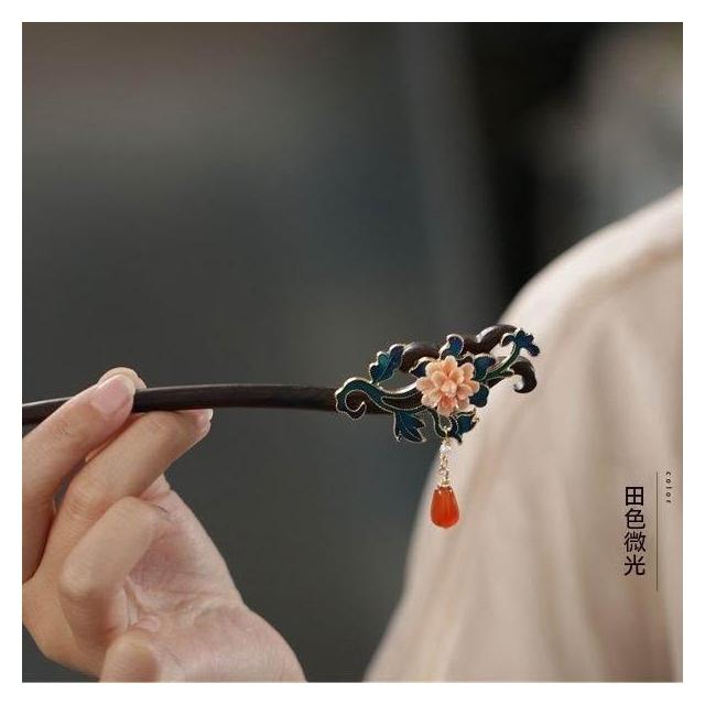 木簪燒藍流蘇頭飾丸子頭髮飾盤發紅色旗袍配飾國風經典簪子新中式