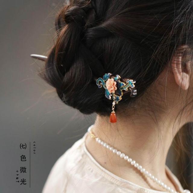 木簪燒藍流蘇頭飾丸子頭髮飾盤發紅色旗袍配飾國風經典簪子新中式