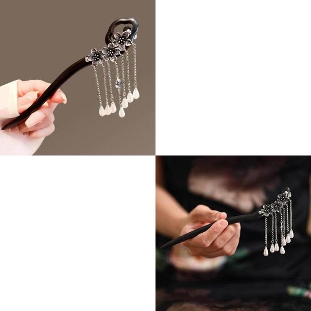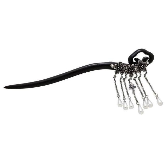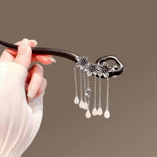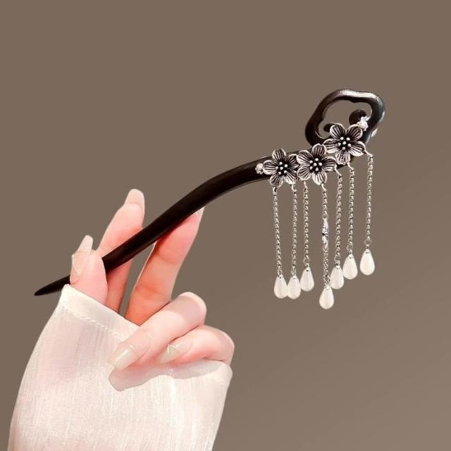 古風黑檀木髮簪女祥雲古銀花朵流蘇步搖氣質盤髮簪子高級感發釵