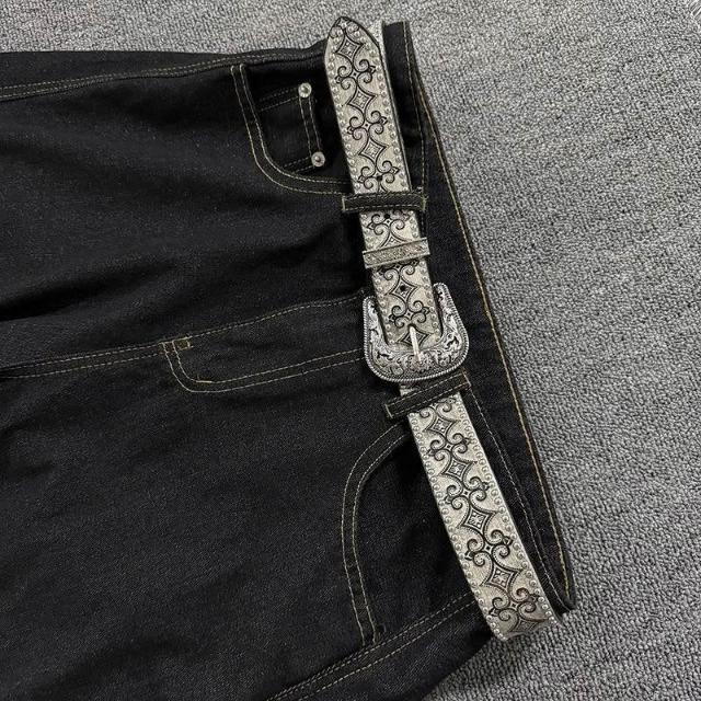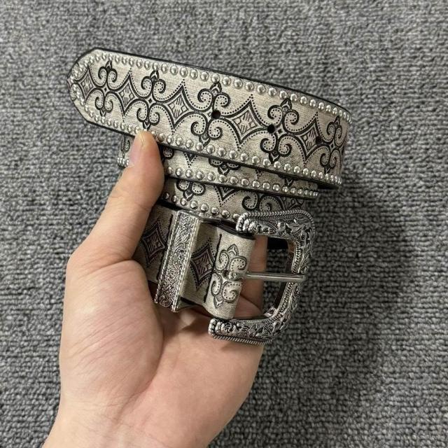 Vintage西部鉚釘皮帶腰帶銀色復古雕花金屬扣頭小衆設計簡約皮帶