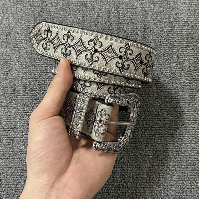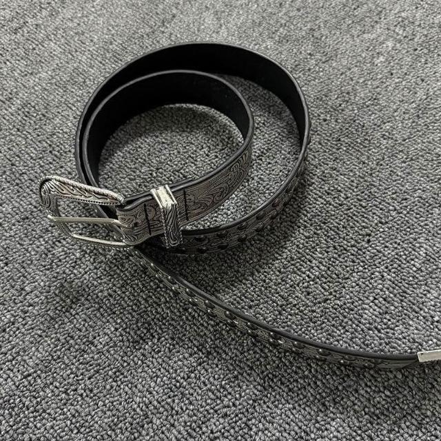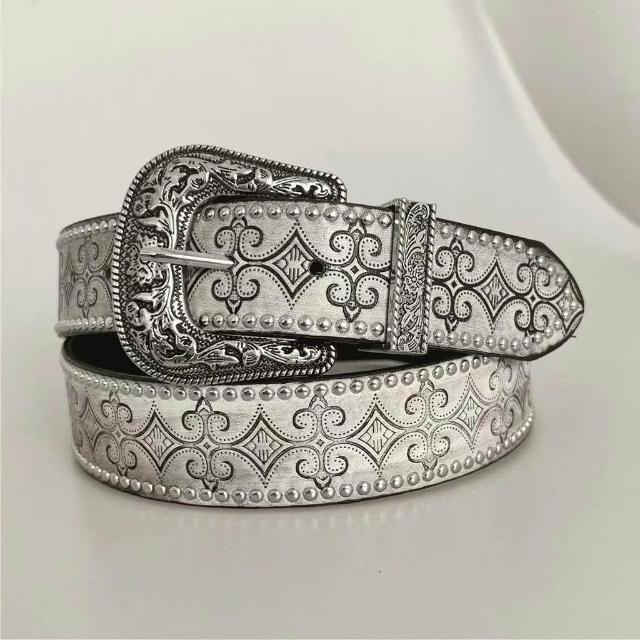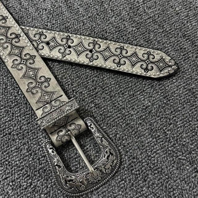 Vintage西部鉚釘皮帶腰帶銀色復古雕花金屬扣頭小衆設計簡約皮帶