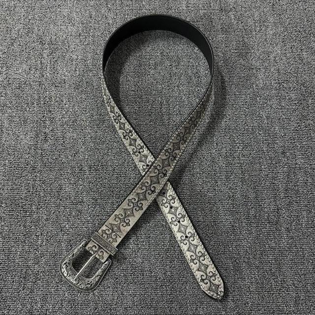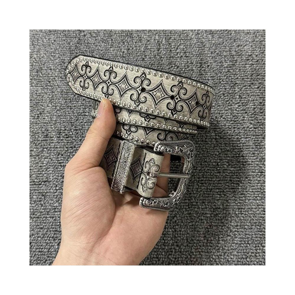 Vintage西部鉚釘皮帶腰帶銀色復古雕花金屬扣頭小衆設計簡約皮帶