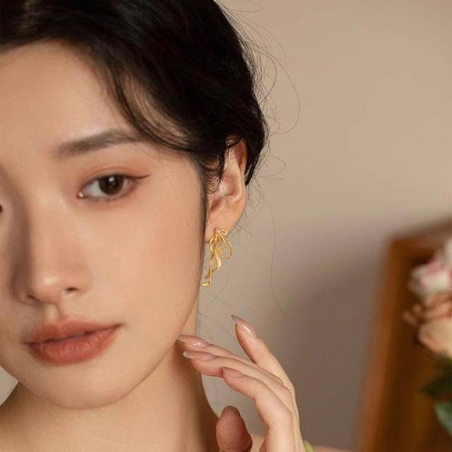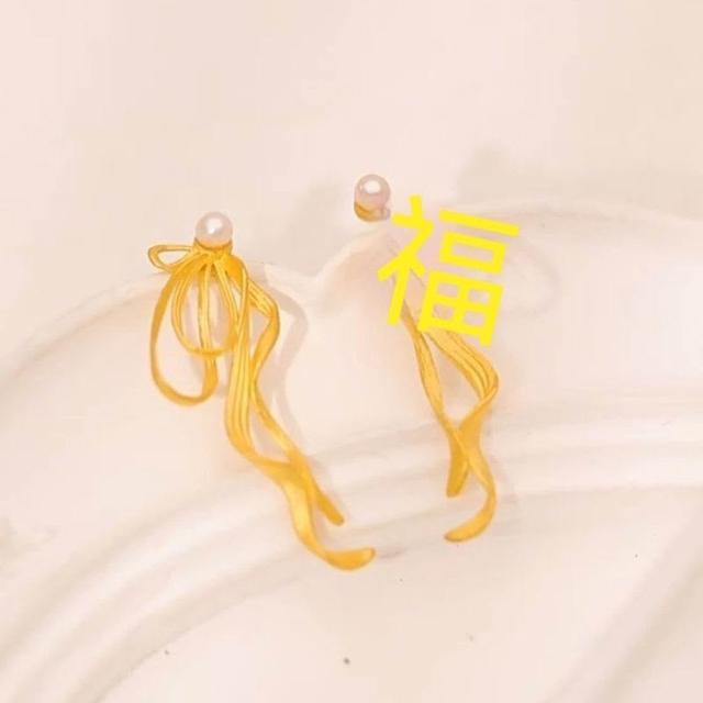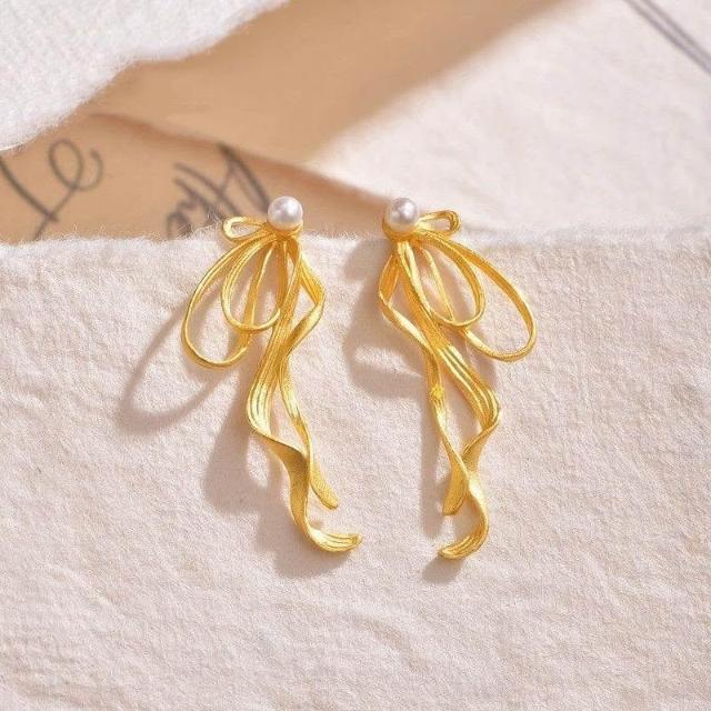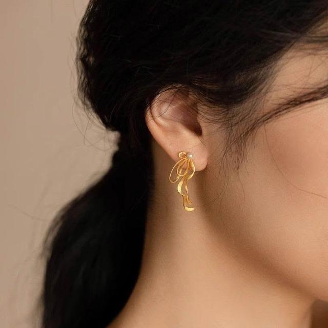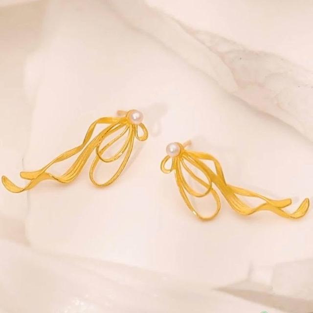 古法浪漫淪陷黃金色珍珠耳環女輕奢素色溫柔絲帶蝴蝶結耳釘耳飾品