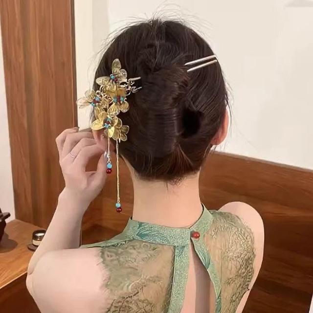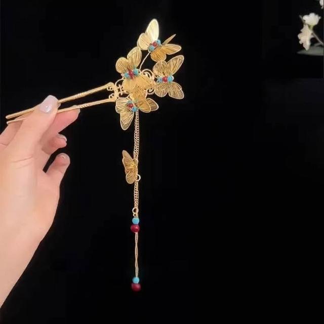 念夏-新中式金色蝴蝶流蘇髮簪復古國風氣質漢服旗袍盤發U型髮釵