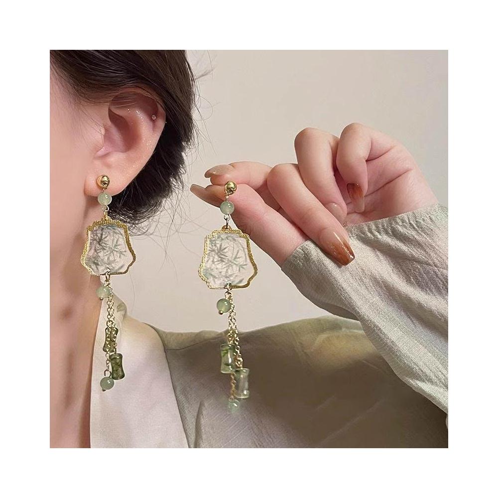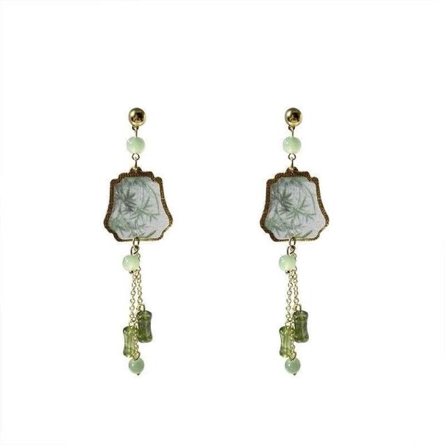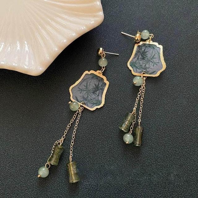 純銀耳釘復古綠色竹節扇子長流蘇耳環女新中式國風古風旗袍耳飾