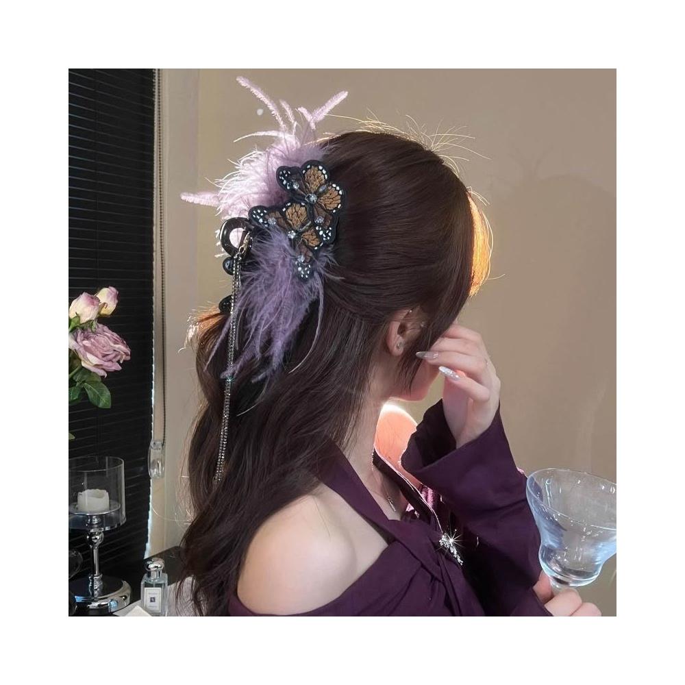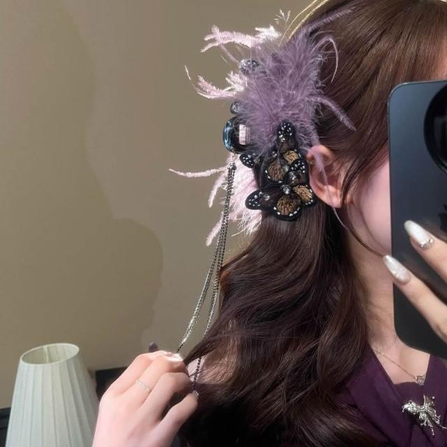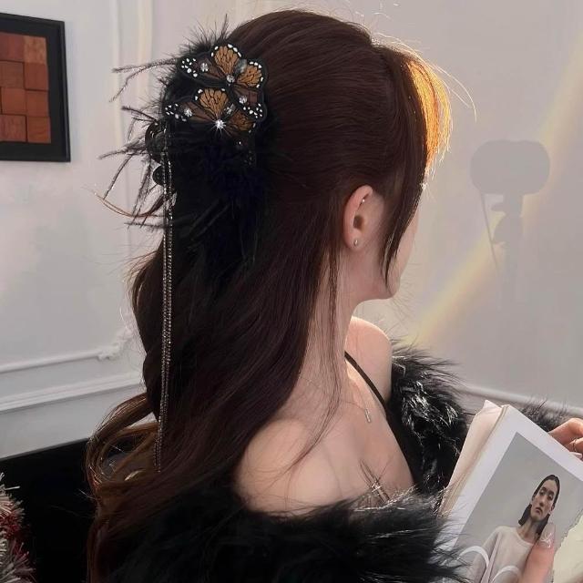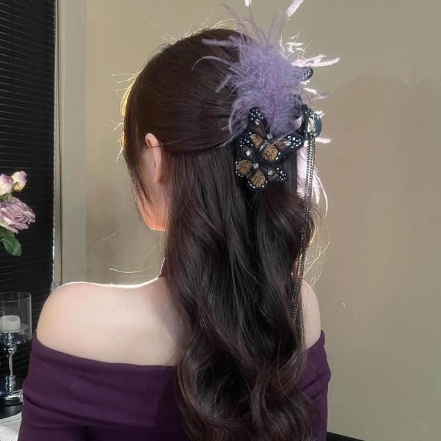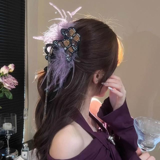 超仙氛圍感羽毛流蘇抓夾女2026新款高級感純欲風鯊魚夾子半扎髮飾