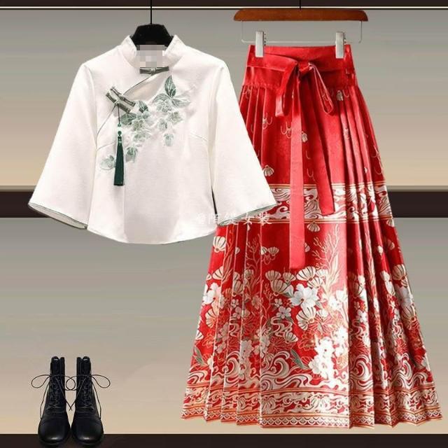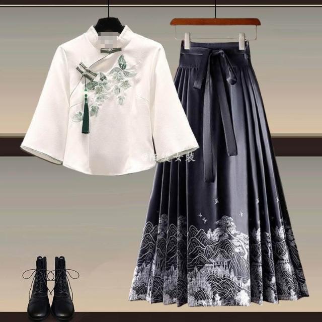 免運 2026 新款新中式女裝兩件套 大碼漢服短袖上衣馬面裙套裝 國風漢元素日常穿搭套 女士新中式馬面裙兩件套 大碼顯瘦