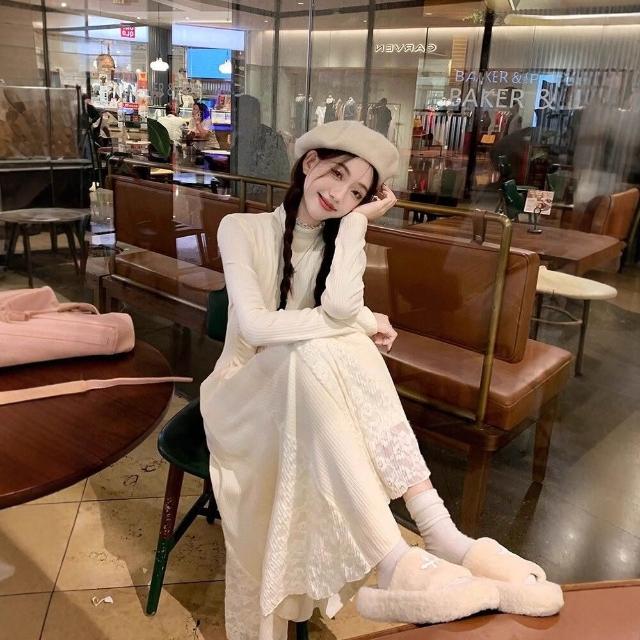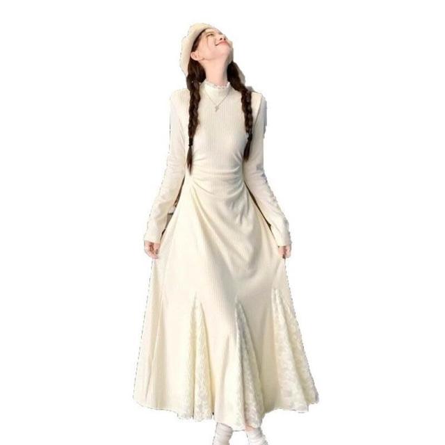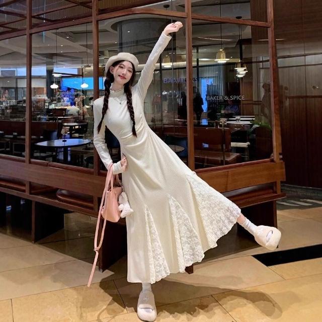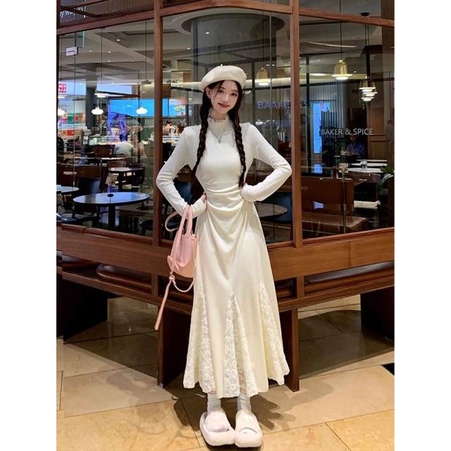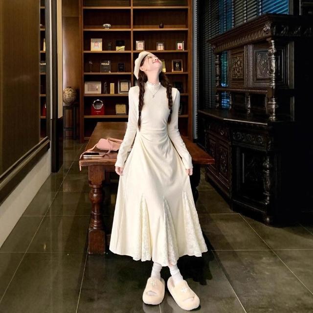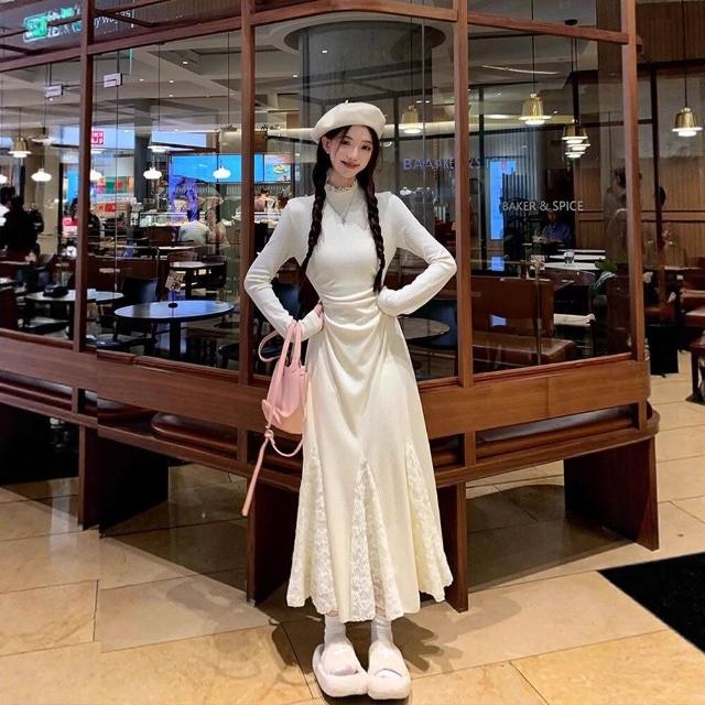 廠家直供 秋冬2025新款法式白色內搭針織連衣裙女收腰顯瘦蕾絲拼接魚尾長裙