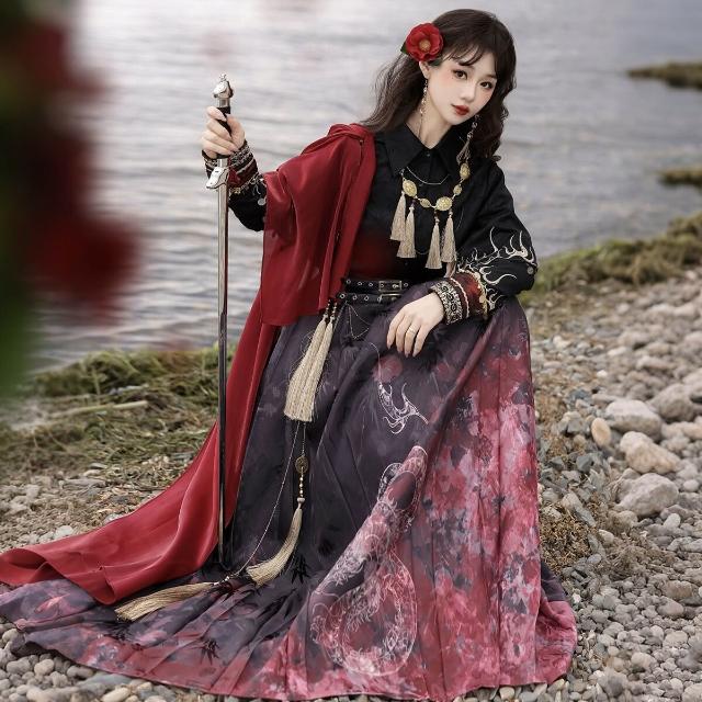 廠家直供 倚夢閣原創炎龍引漢服女中國風漢元素上衣半裙腰鏈項鏈套裝9498