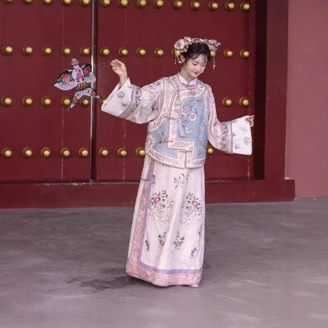 廠家直供 漢服女清代印花古裝清朝延吉公主旗袍宮廷格格服兩件套旅拍服裝女