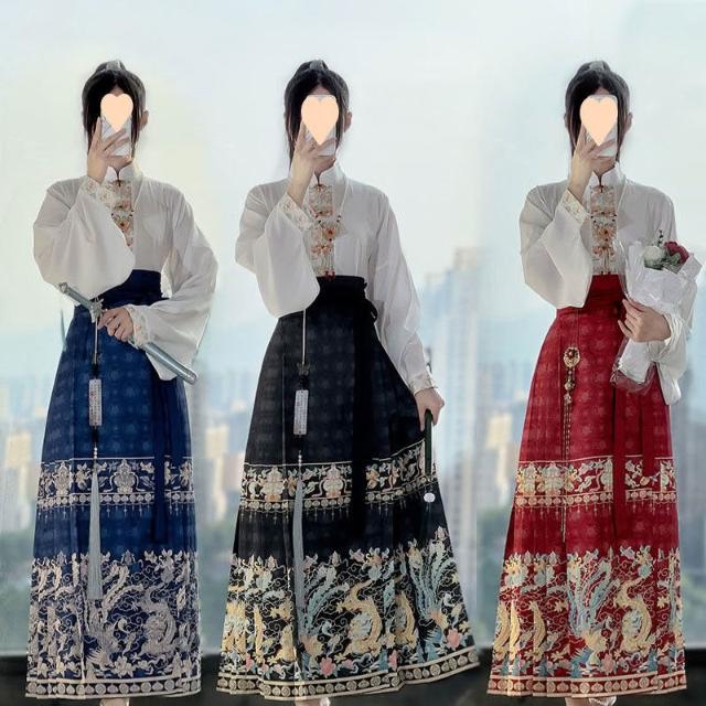 廠家直供 明製漢服女紅色馬面裙套裝 成人款敬酒服國風上衣 改良古裝日常穿搭套 紅色顯氣質馬面裙套裝 女士結婚敬酒服漢服套