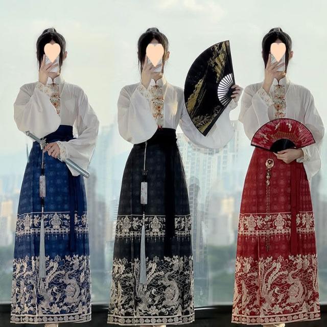 廠家直供 明製漢服女紅色馬面裙套裝 成人款敬酒服國風上衣 改良古裝日常穿搭套 紅色顯氣質馬面裙套裝 女士結婚敬酒服漢服套