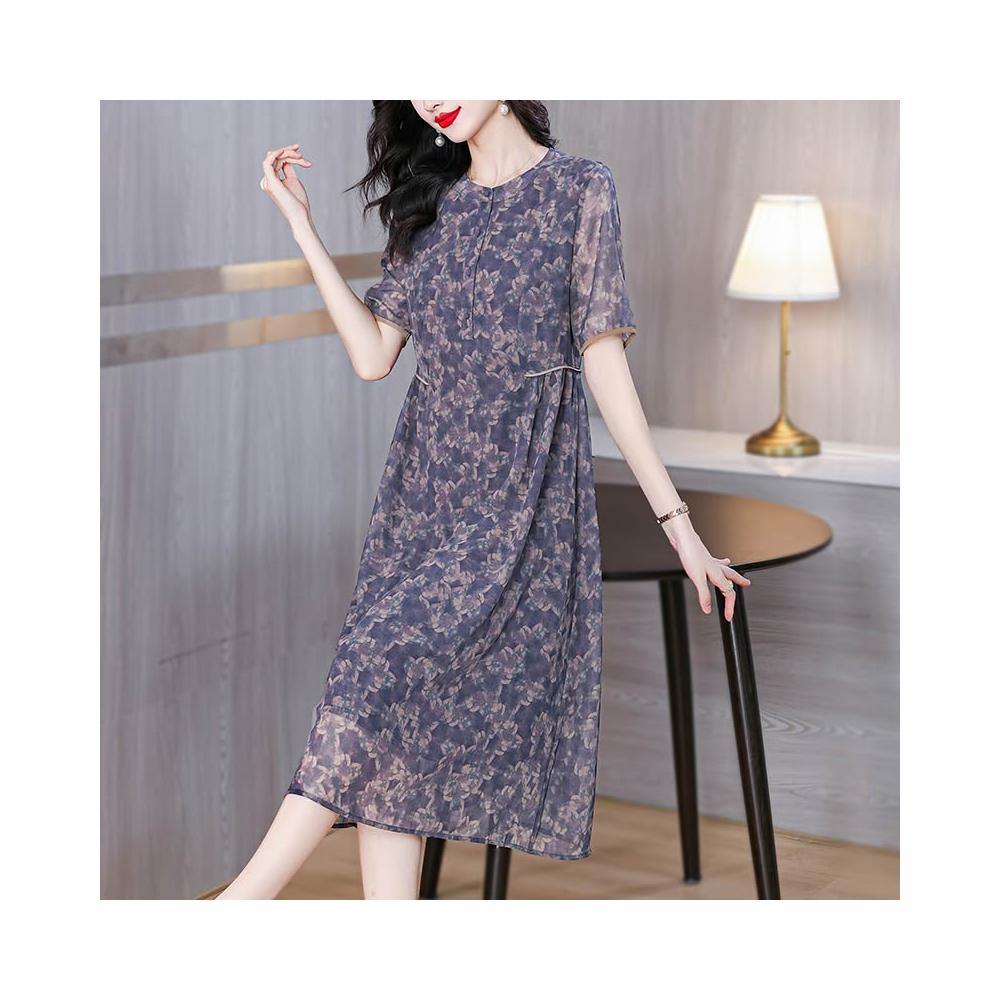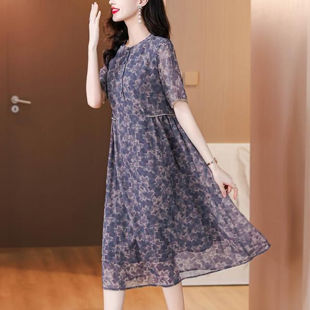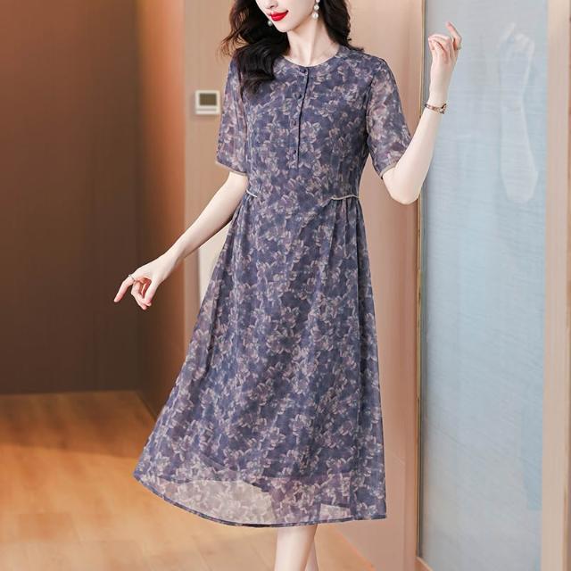 新款 裙子 連衣裙 大牌中年媽媽喬其紗連衣裙2024新款大碼女裝寬松高端雪紡裙子夏季 鑫奧精品