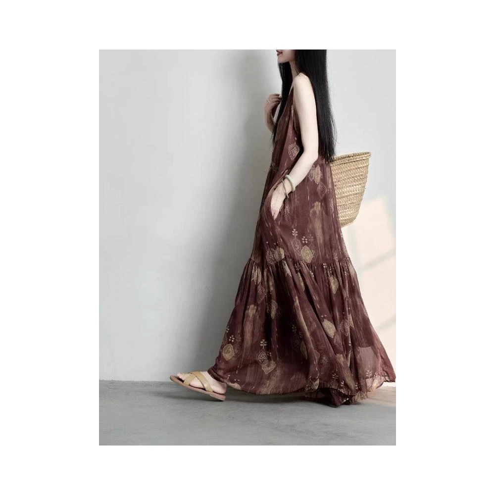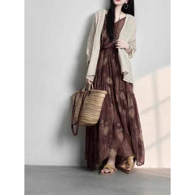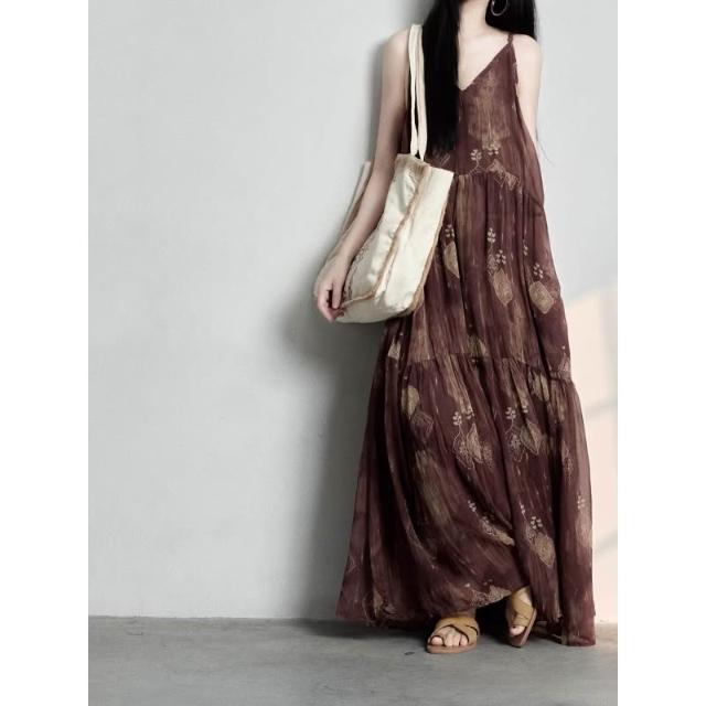 新款 裙子 連衣裙 2026年夏季波西米亞度假印花吊帶連衣裙 復古咖紅 鑫奧精品