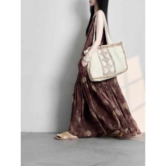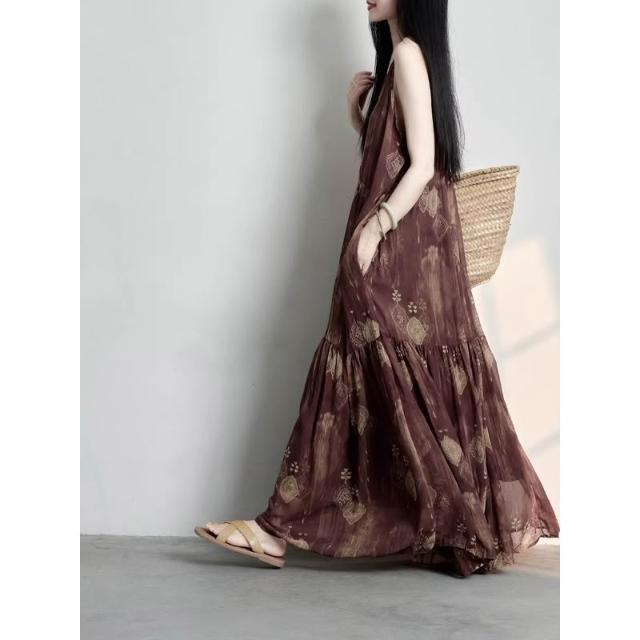 新款 裙子 連衣裙 2026年夏季波西米亞度假印花吊帶連衣裙 復古咖紅 鑫奧精品