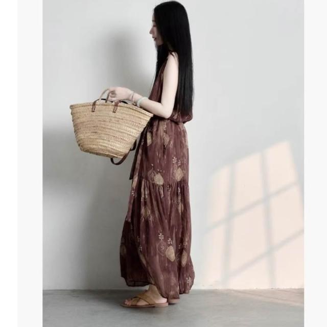 新款 裙子 連衣裙 2026年夏季波西米亞度假印花吊帶連衣裙 復古咖紅 鑫奧精品