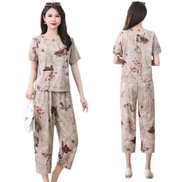新款 套裝 兩件套 媽媽印花套裝兩件套T恤短袖綿綢40-60歲奶奶裝中老年人女夏季外穿 鑫奧精品