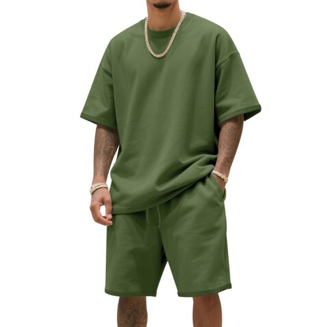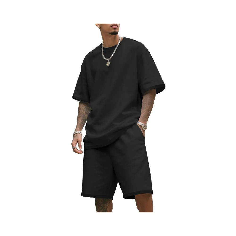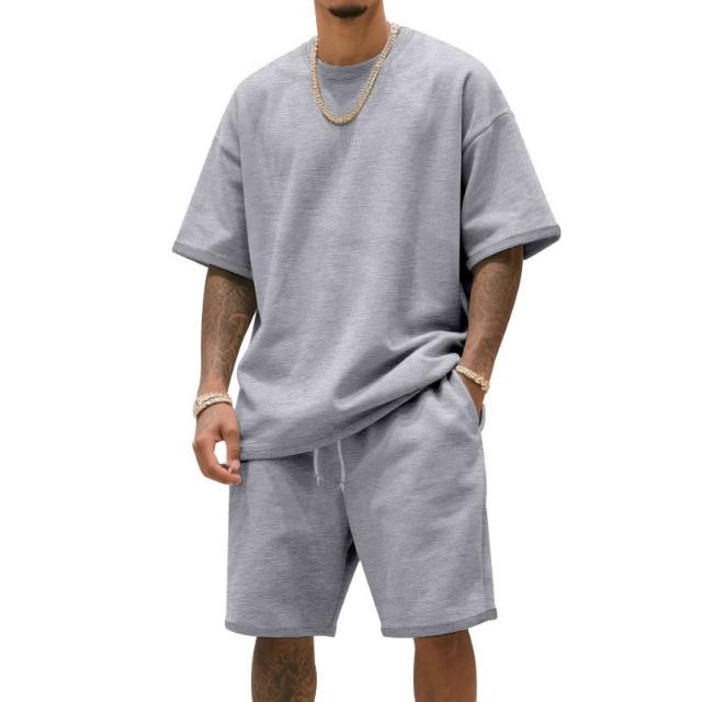 新款 短袖 套裝 跨境歐美男士夏季美式寬松重磅毛圈高街潮流嘻哈運動短袖短褲套裝 鑫奧精品