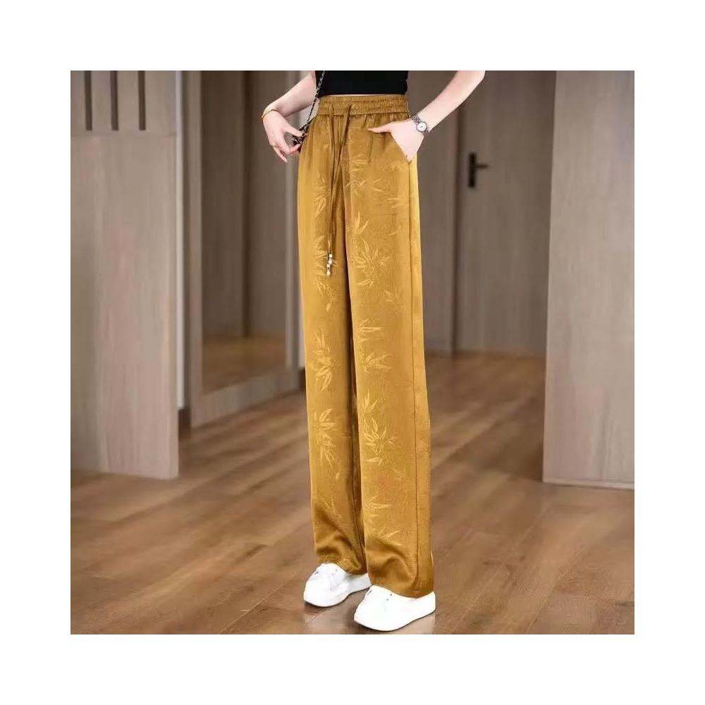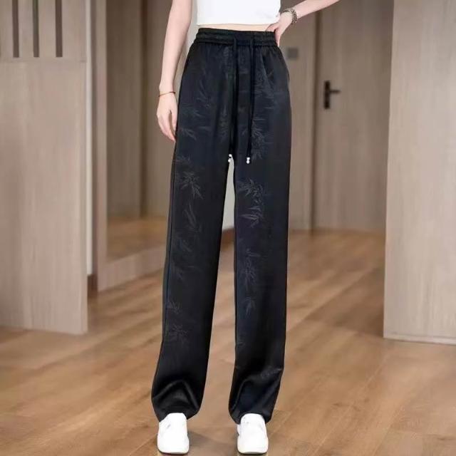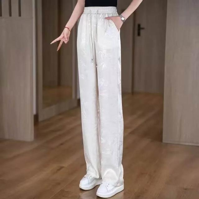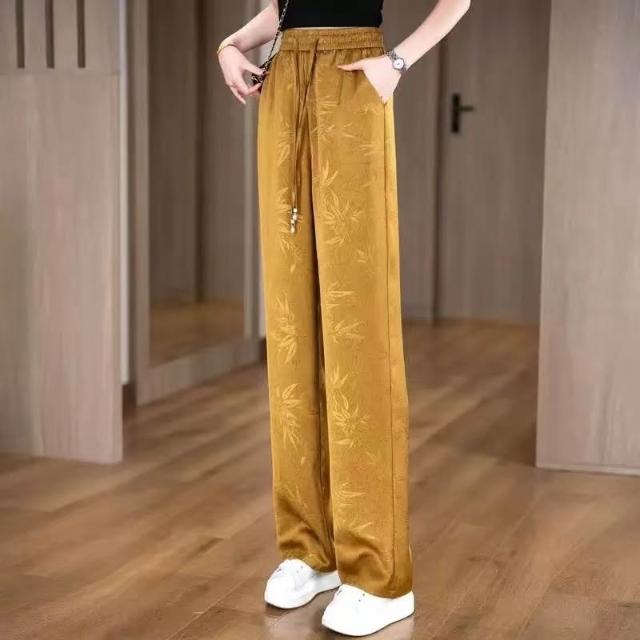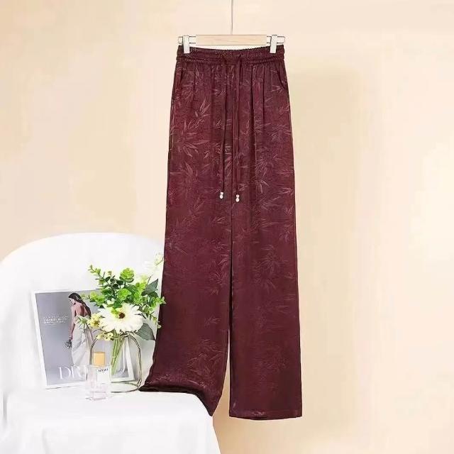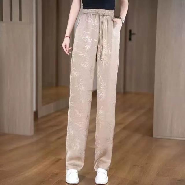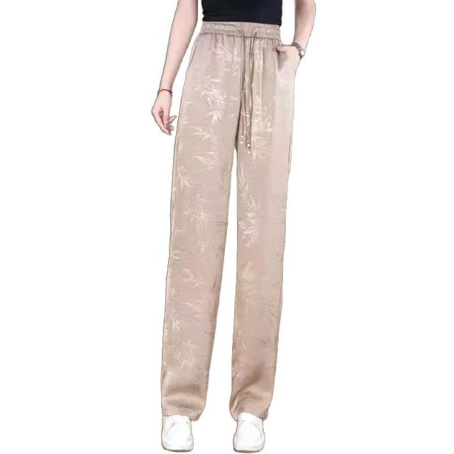 新款 夏季 休閒褲 金竹暗紋壓花時尚垂感冰絲褲夏季松緊腰窄版闊腿直筒褲女士休閑褲 鑫奧精品