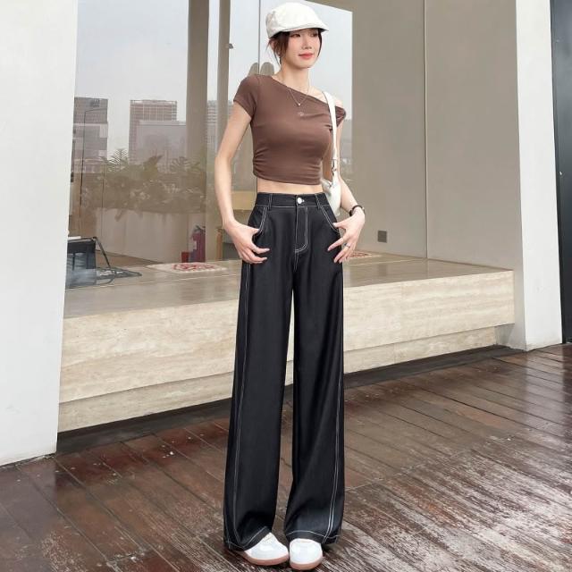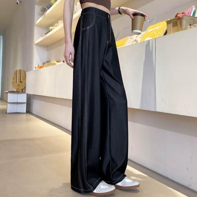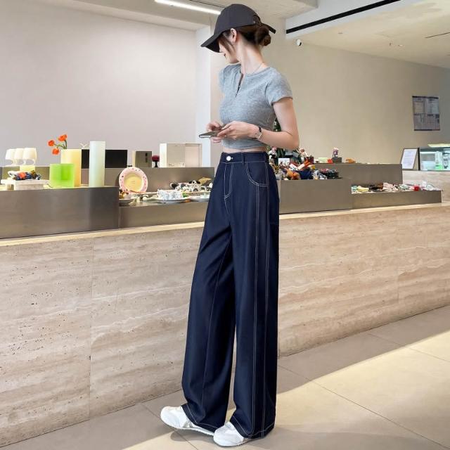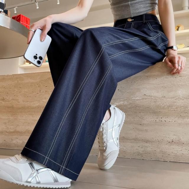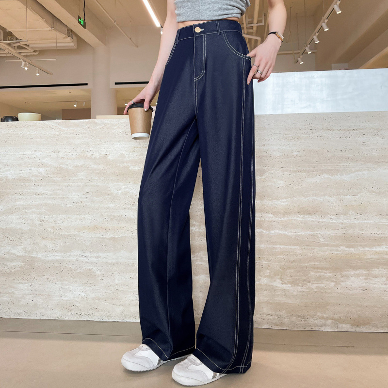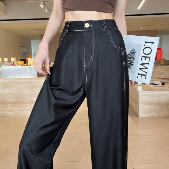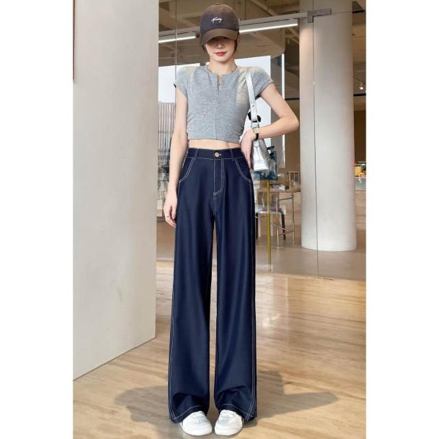 新款 夏季 牛仔褲 實拍萊賽爾仿牛仔女夏季薄款新款高腰垂感小個子冰絲闊腿褲現貨 鑫奧精品