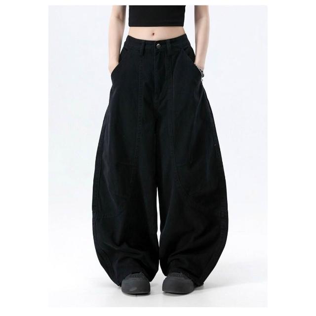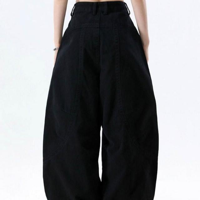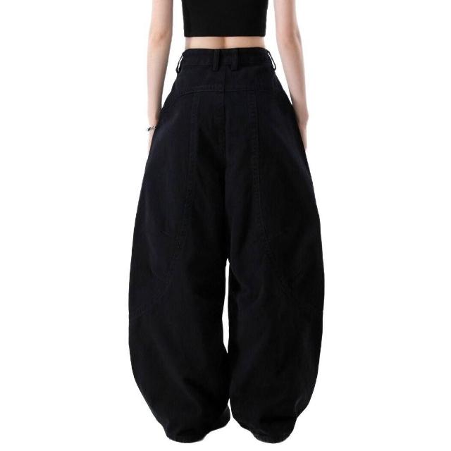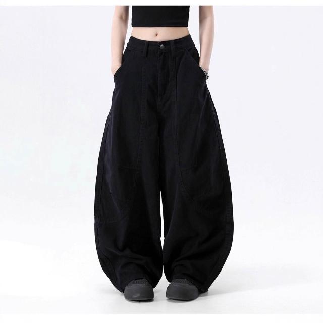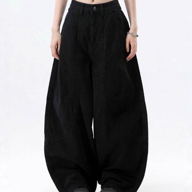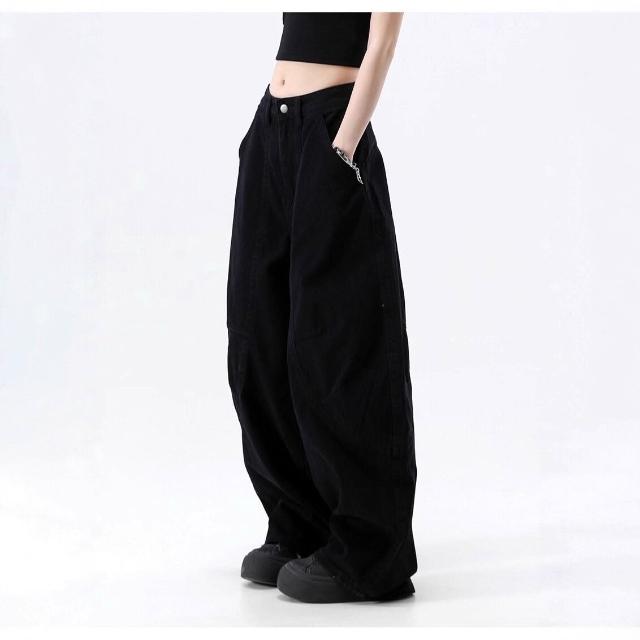 S~5XL 大碼 美式 拼接 黑色 彎刀褲 牛仔褲女 秋冬女裝 高腰 設計感 垂感 闊腿褲 秋冬褲子 長褲