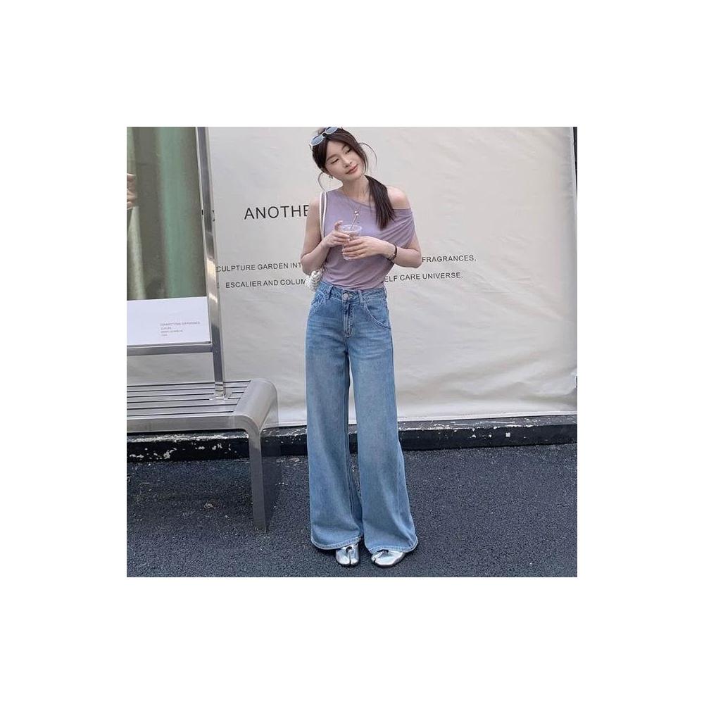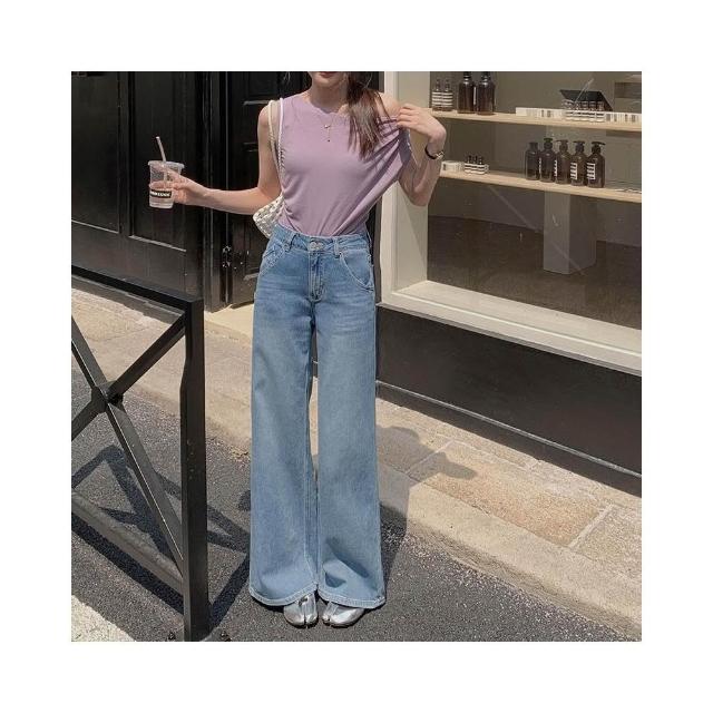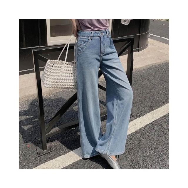 新品 含發票 夏季新款韓版高腰寬松顯瘦垂感百搭直筒長褲子淺藍色闊腿牛仔褲女